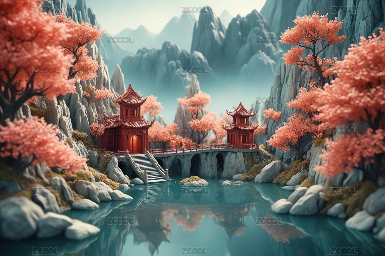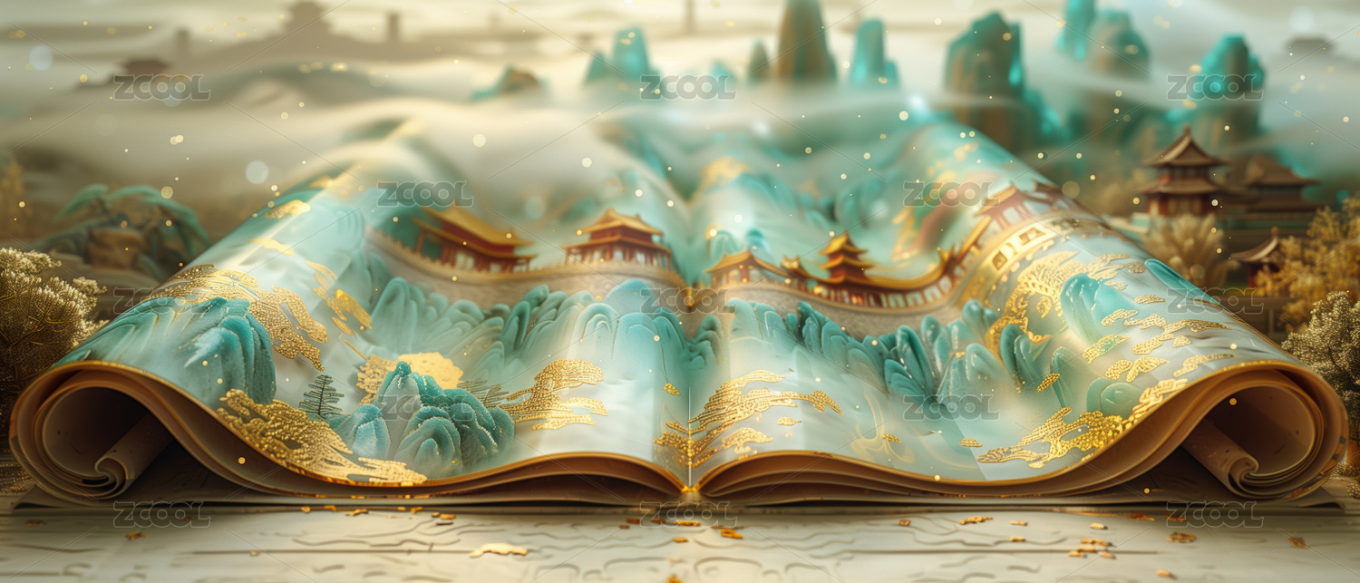 书,中国,禅宗,3d,绿色,白色,瀑布,河流,自然,风景