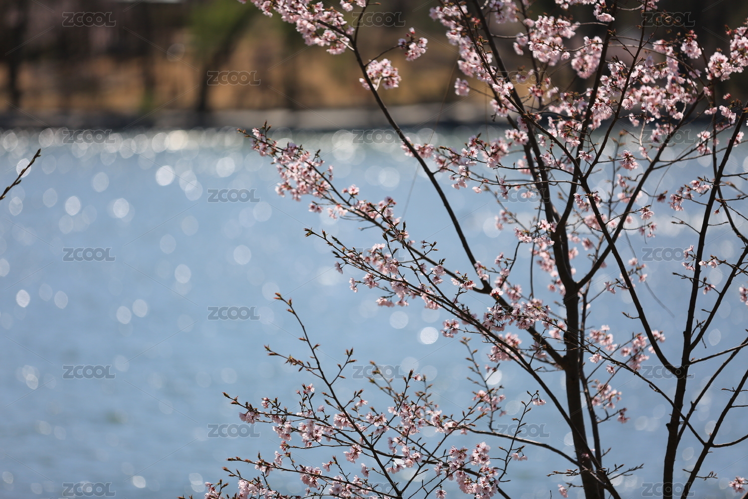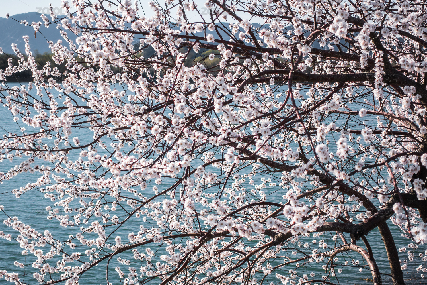春天伸向湖面的桃花枝