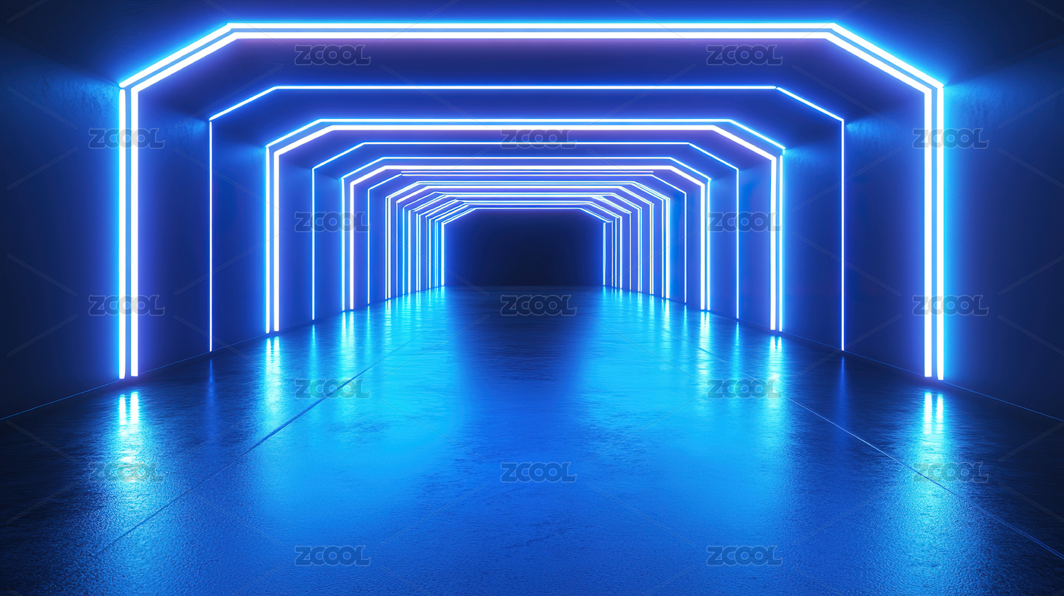 3D渲染科幻几何隧道霓虹灯线概念插图