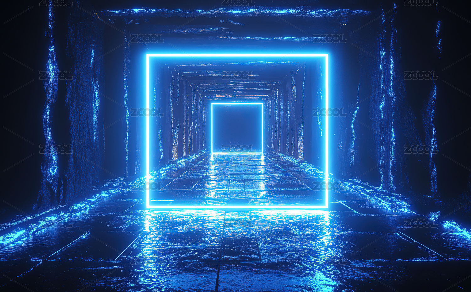 蓝色霓虹光隧道水反射