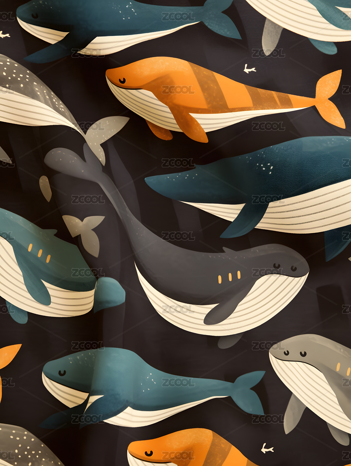 彩色鲸鱼群动物水彩无缝图案纹理