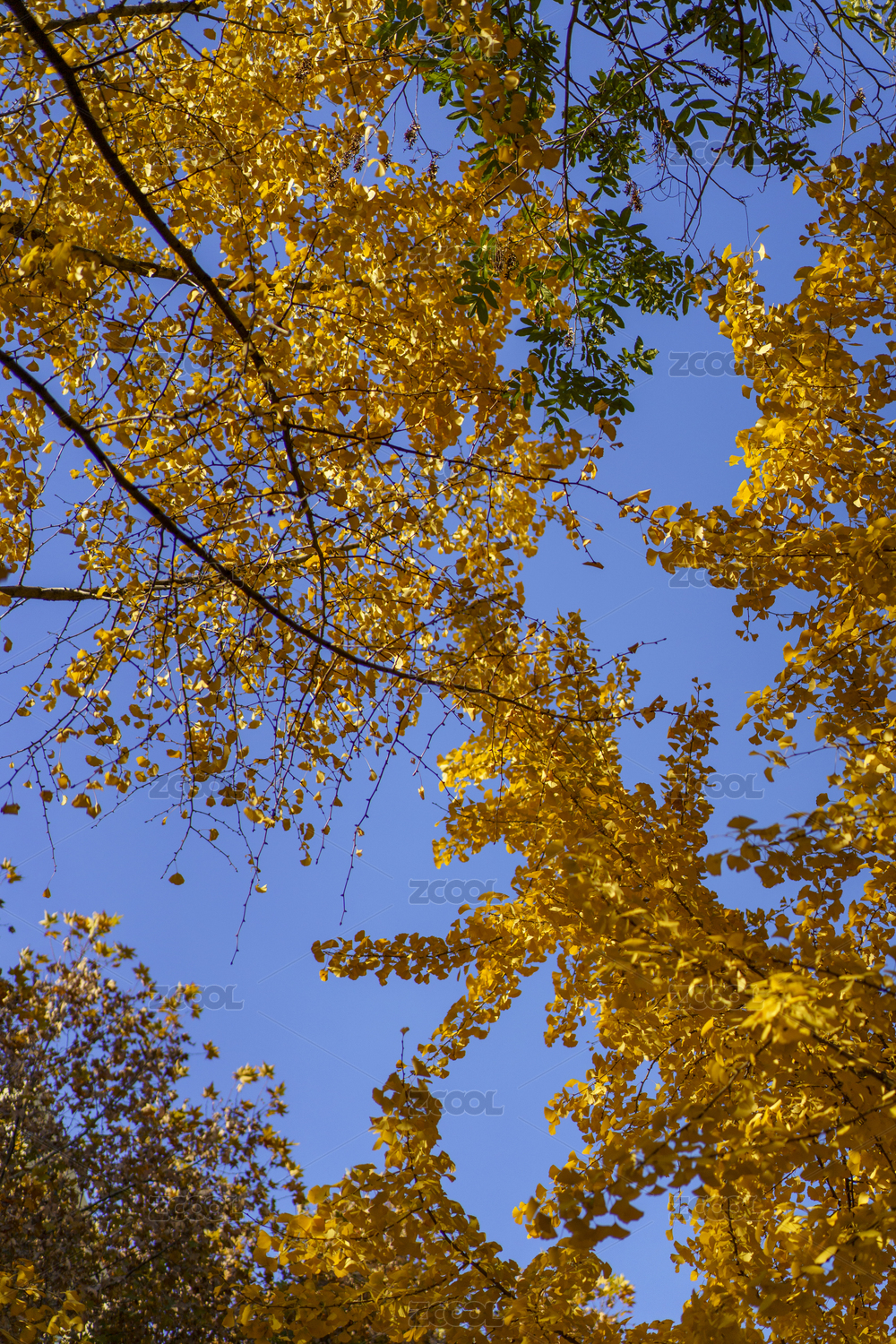 秋天的银杏林,仰视金色的银杏叶及湛蓝的天空