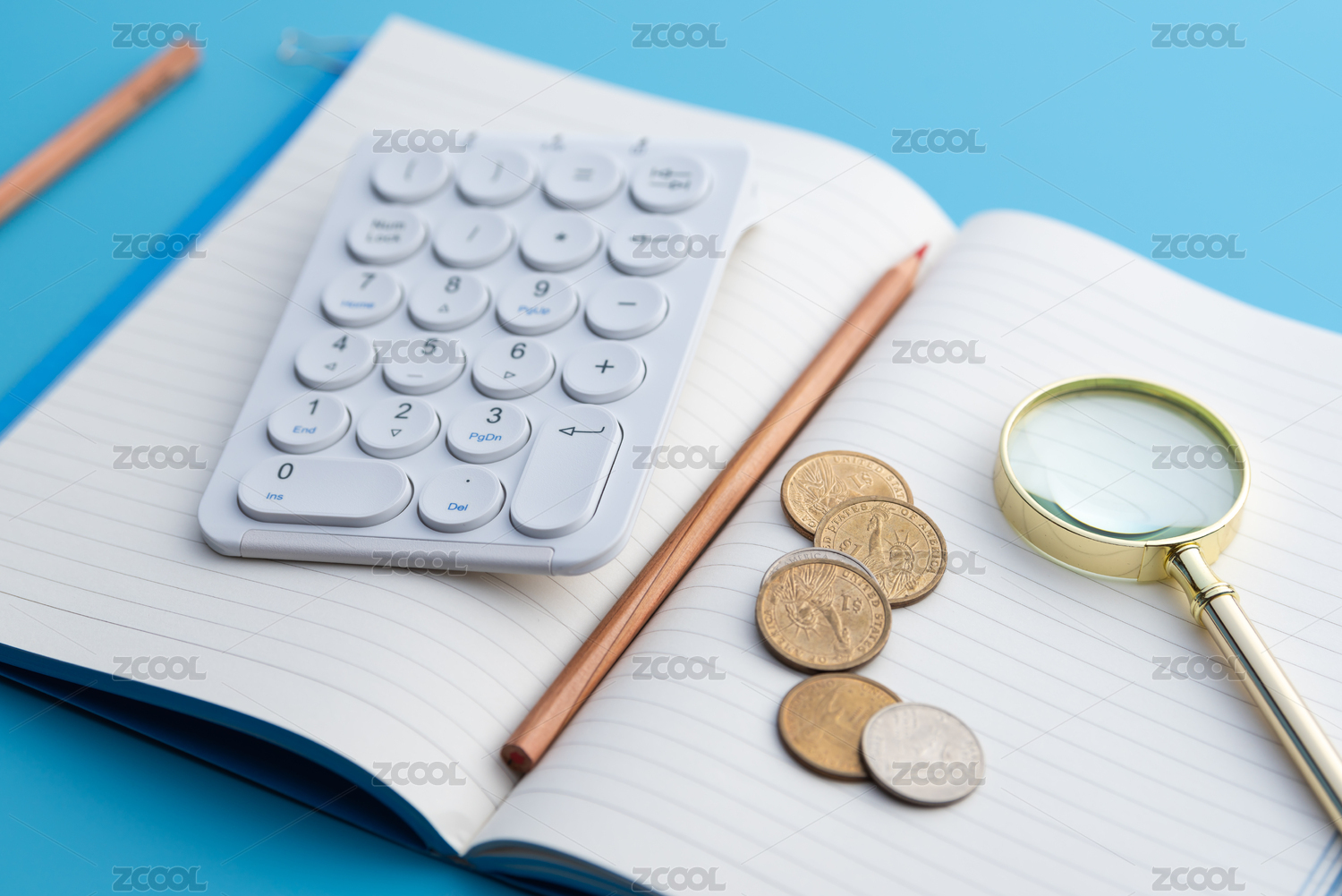 金融图表资料上的计算器和美元硬币及一把放大镜