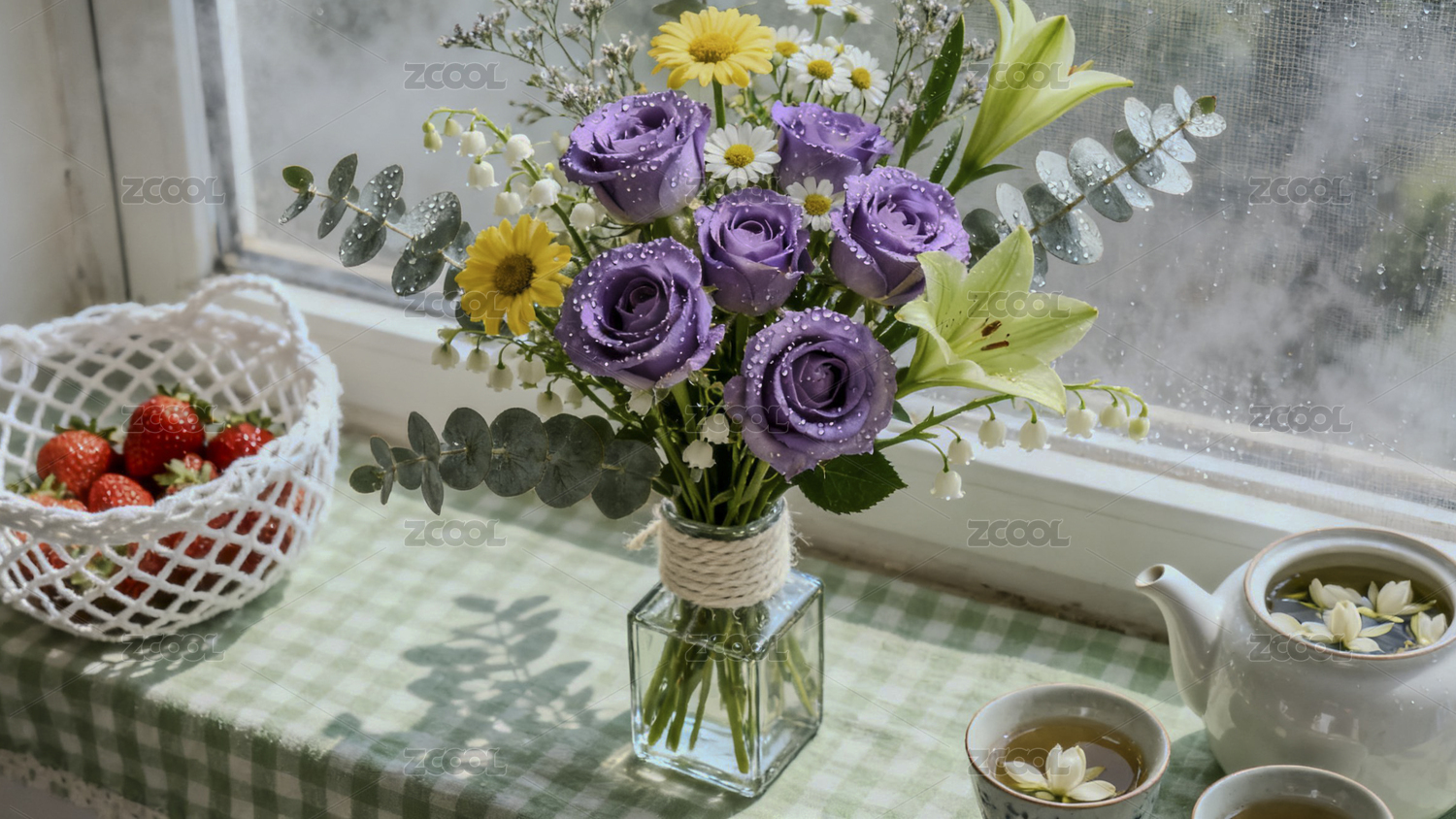 桌子上的一杯咖啡和一束粉色蔷薇鲜花