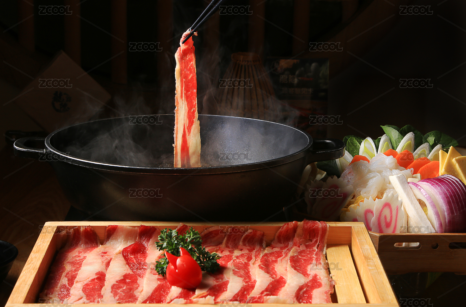 放在黑色火锅里的肥牛卷和蔬菜食材