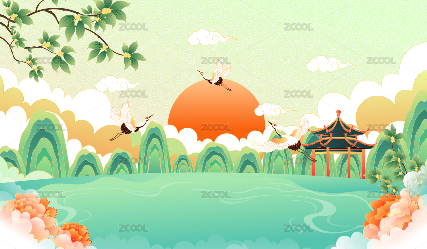 仙鹤在山水祥云间飞翔风景国潮矢量插画