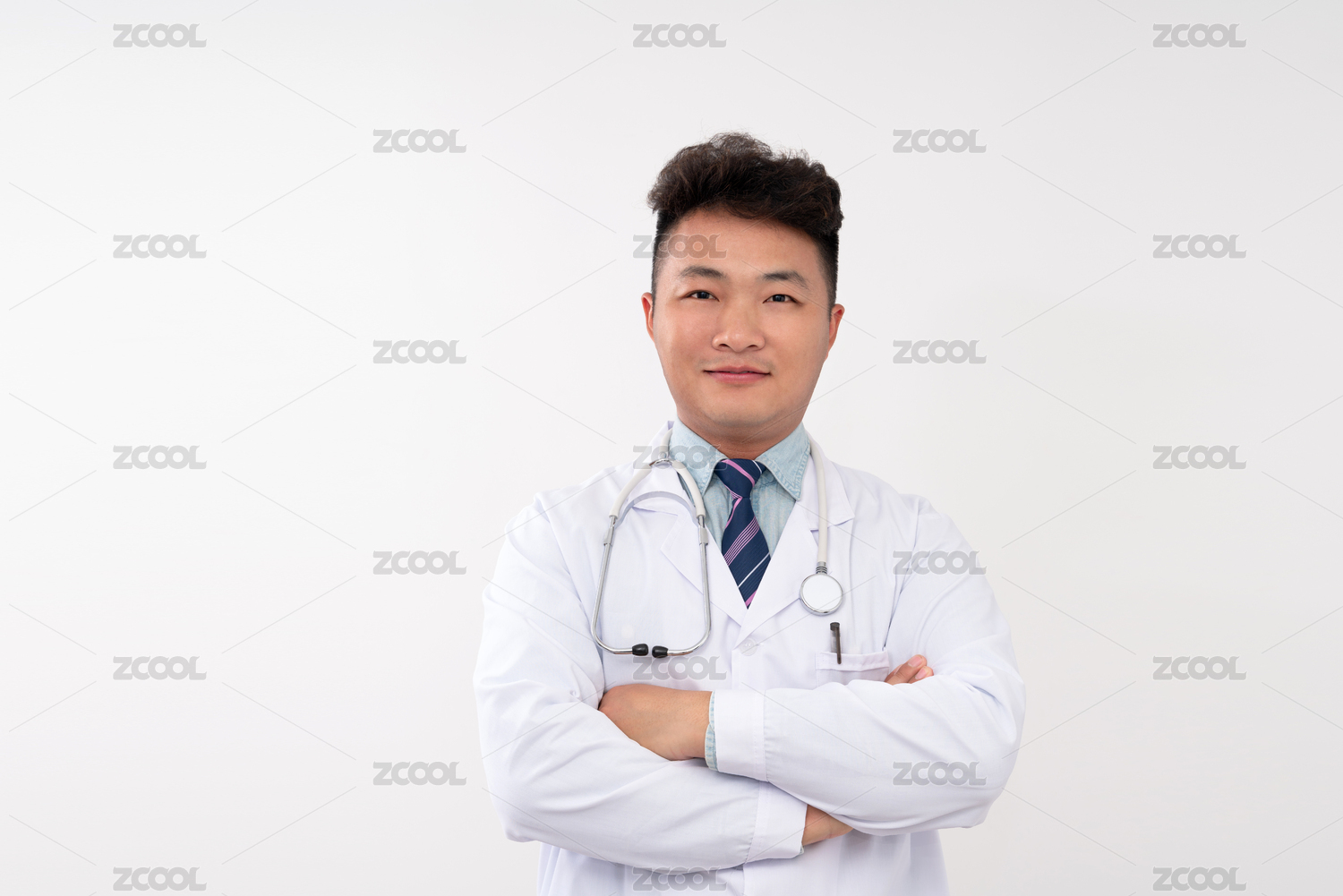 白色背景里双手抱胸的亚洲男医生