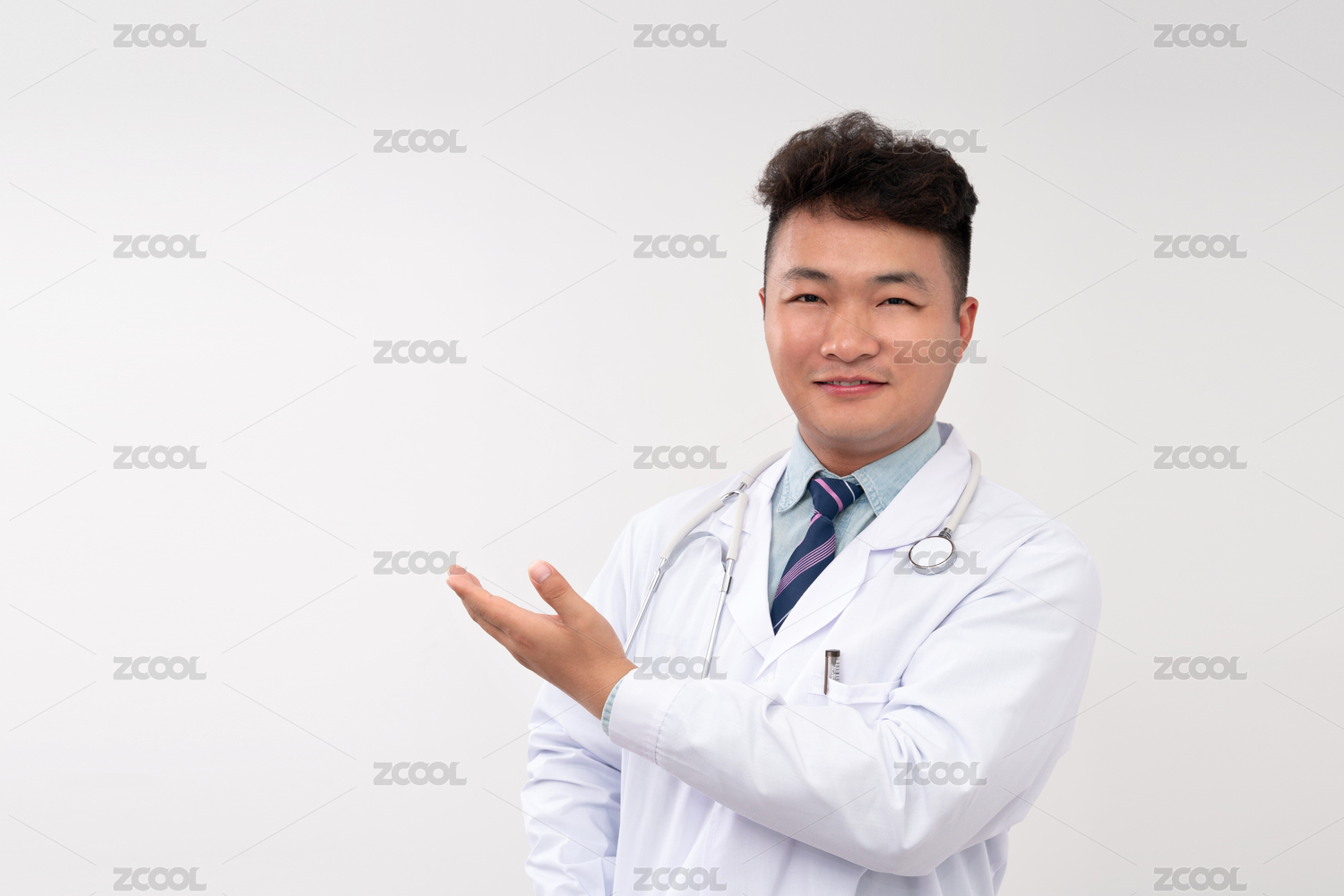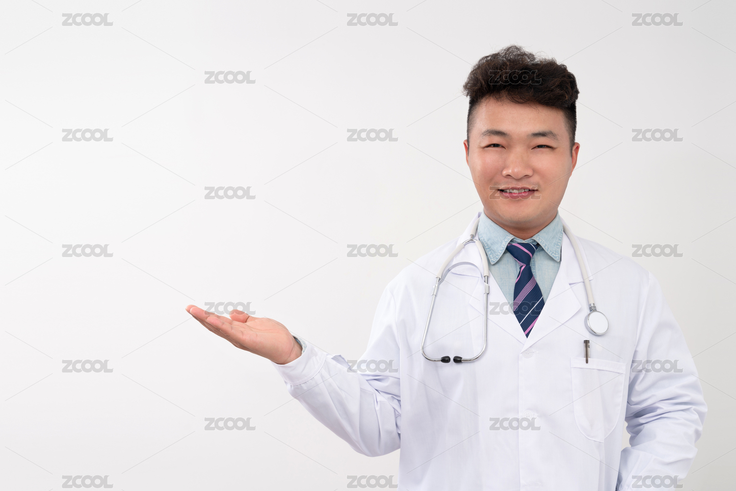 亚洲男医生一只手做出展示动作,白色背景