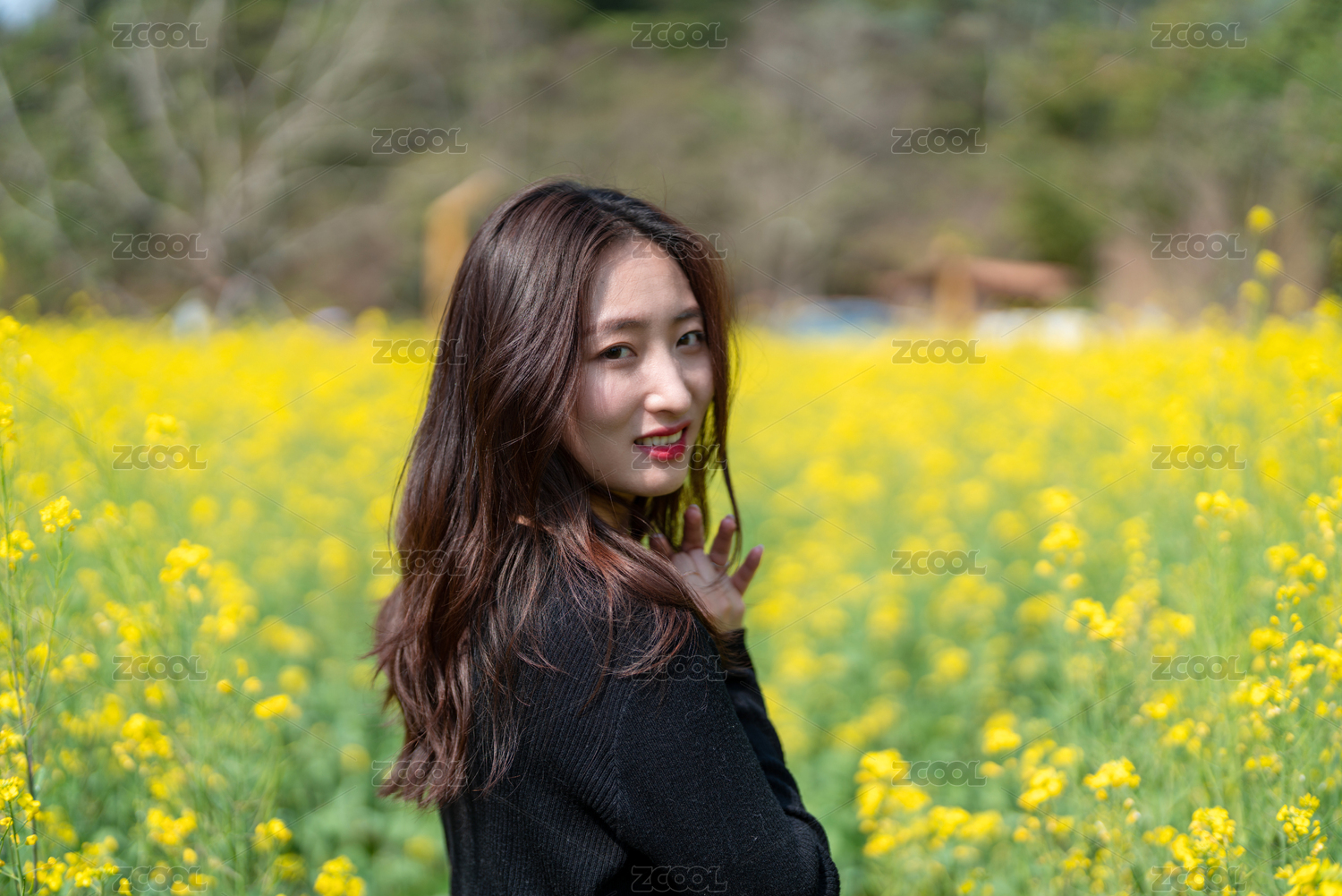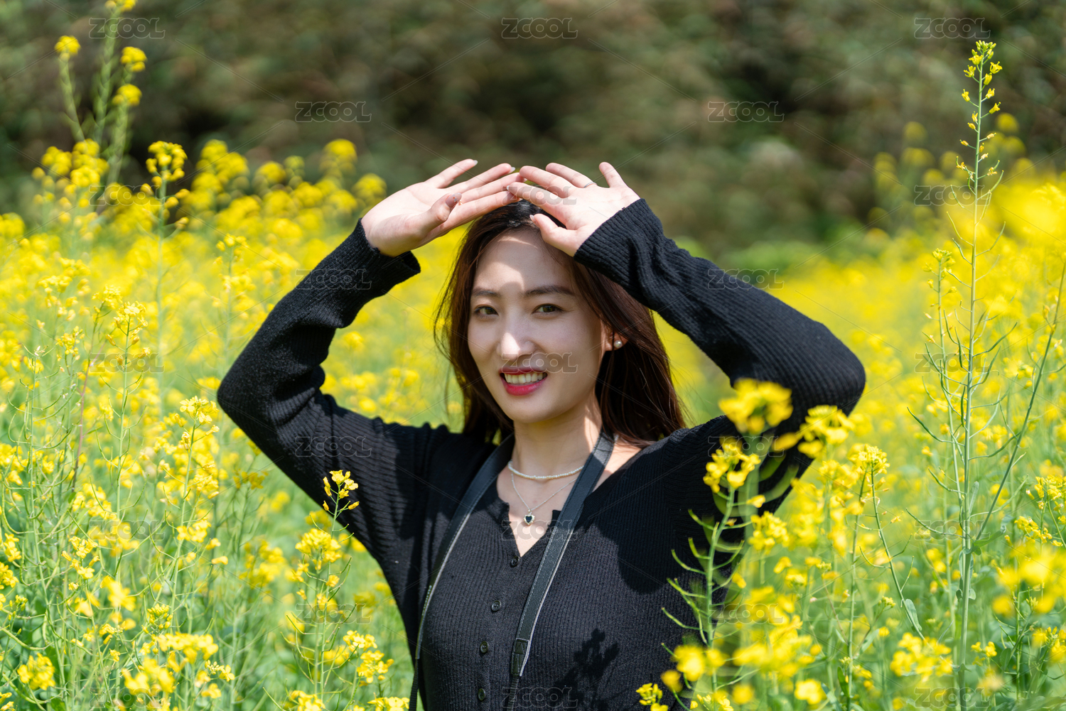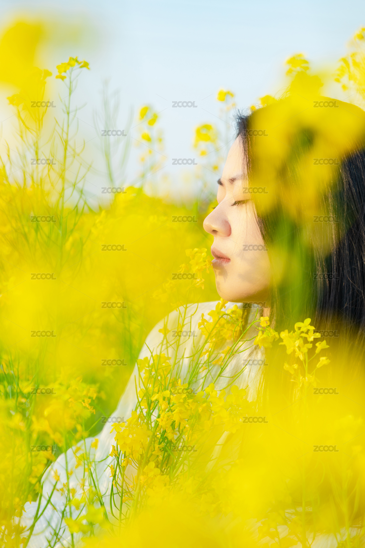 美丽年轻的中国女子陶醉在绿色的油菜花田里