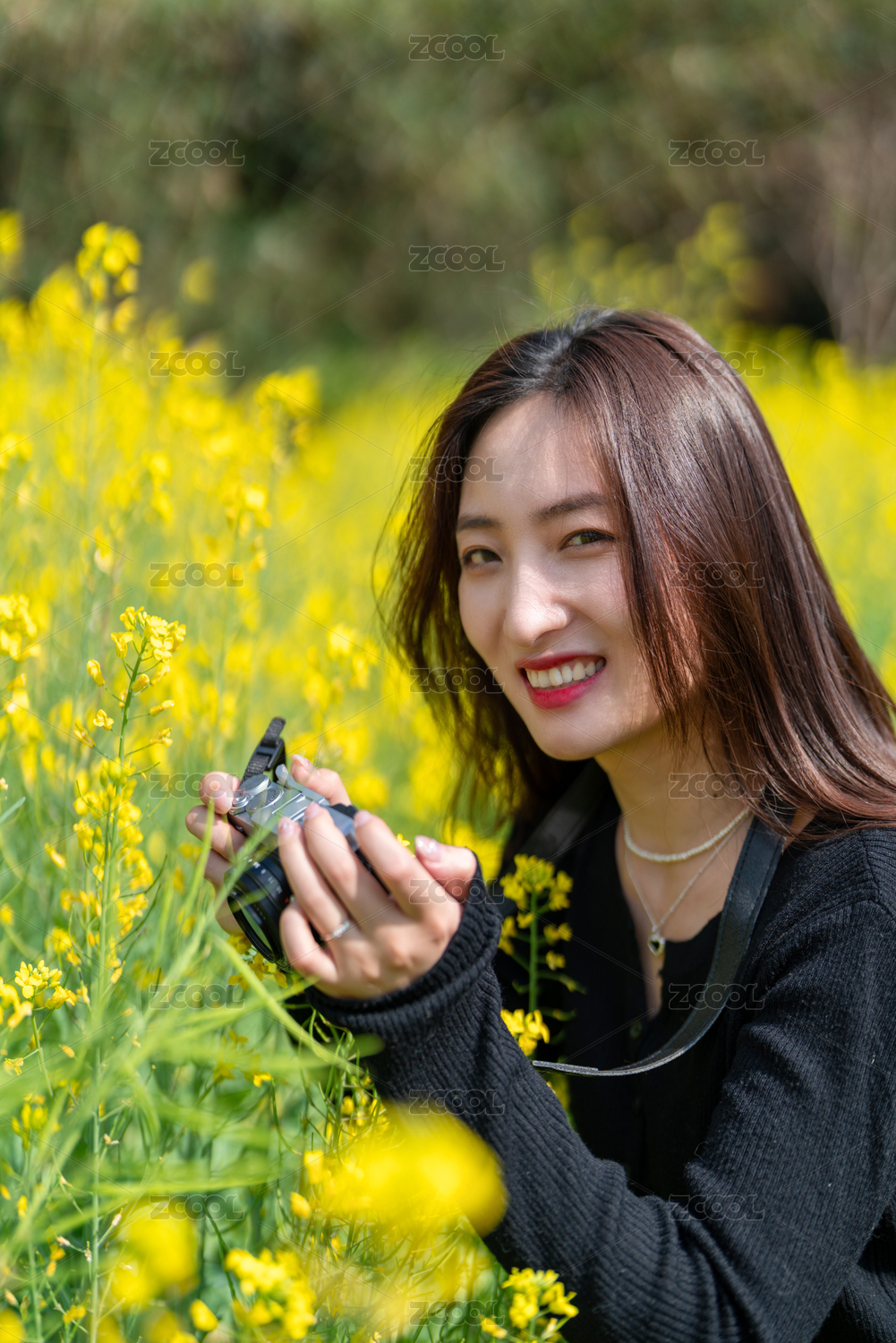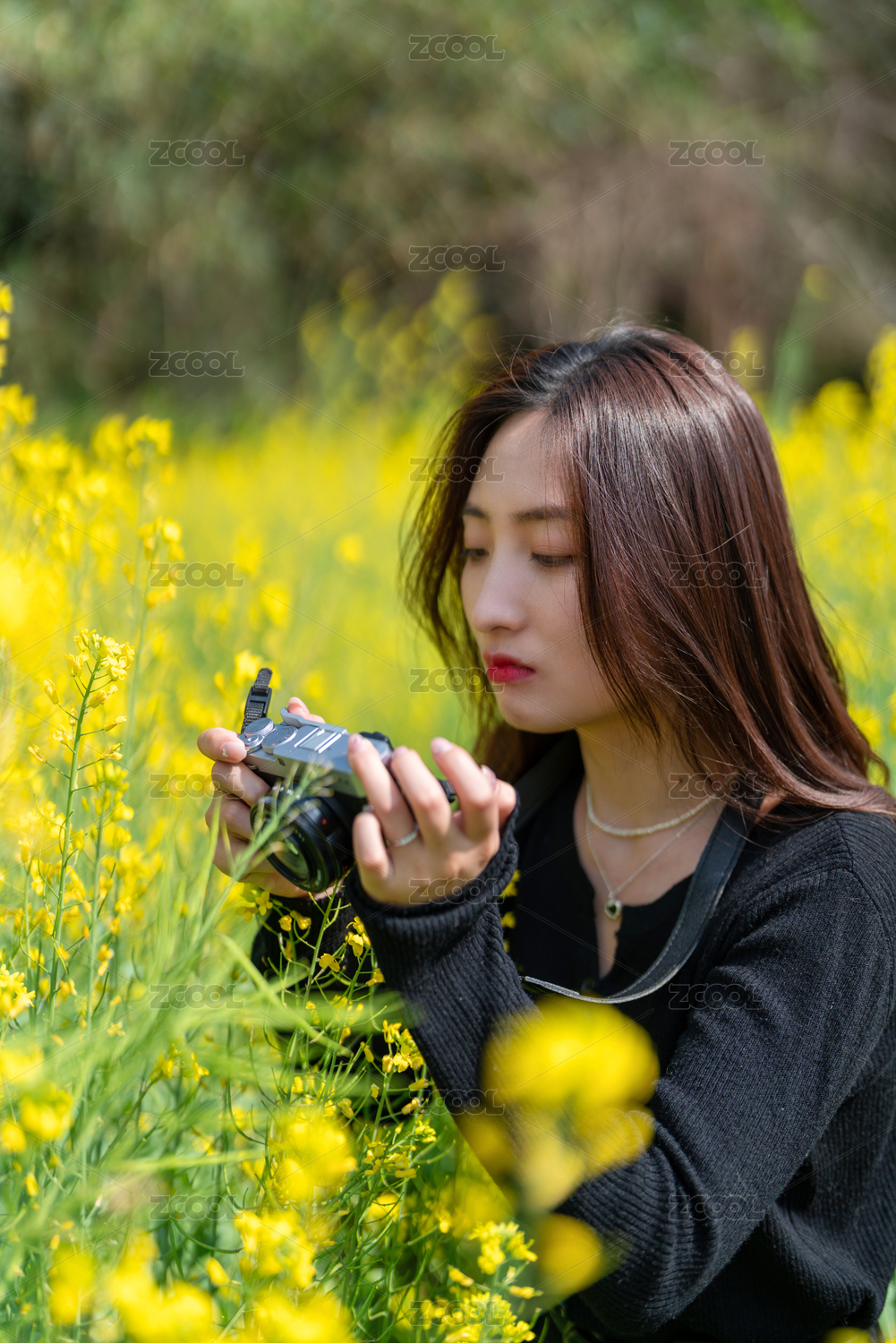 户外,美女,相机,花丛,簇拥,花朵,花,植物,公园,年轻
