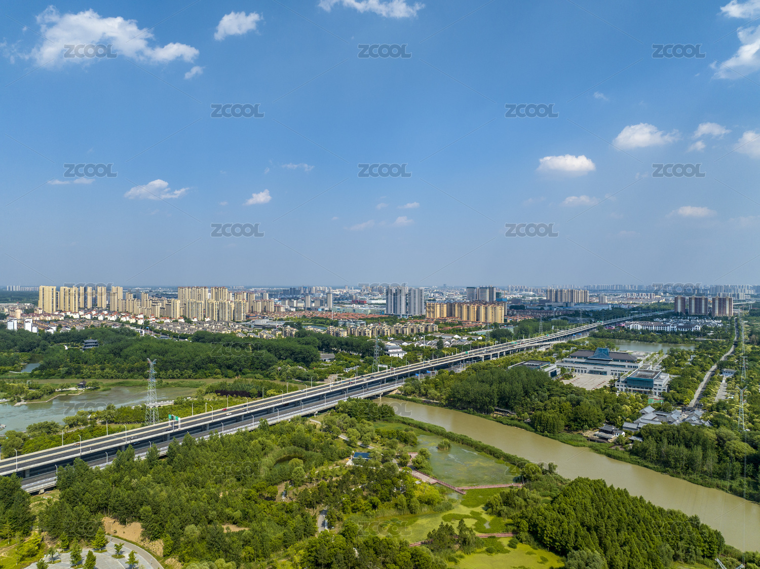航拍中国河南禹州市颍河上的桥和两岸景观