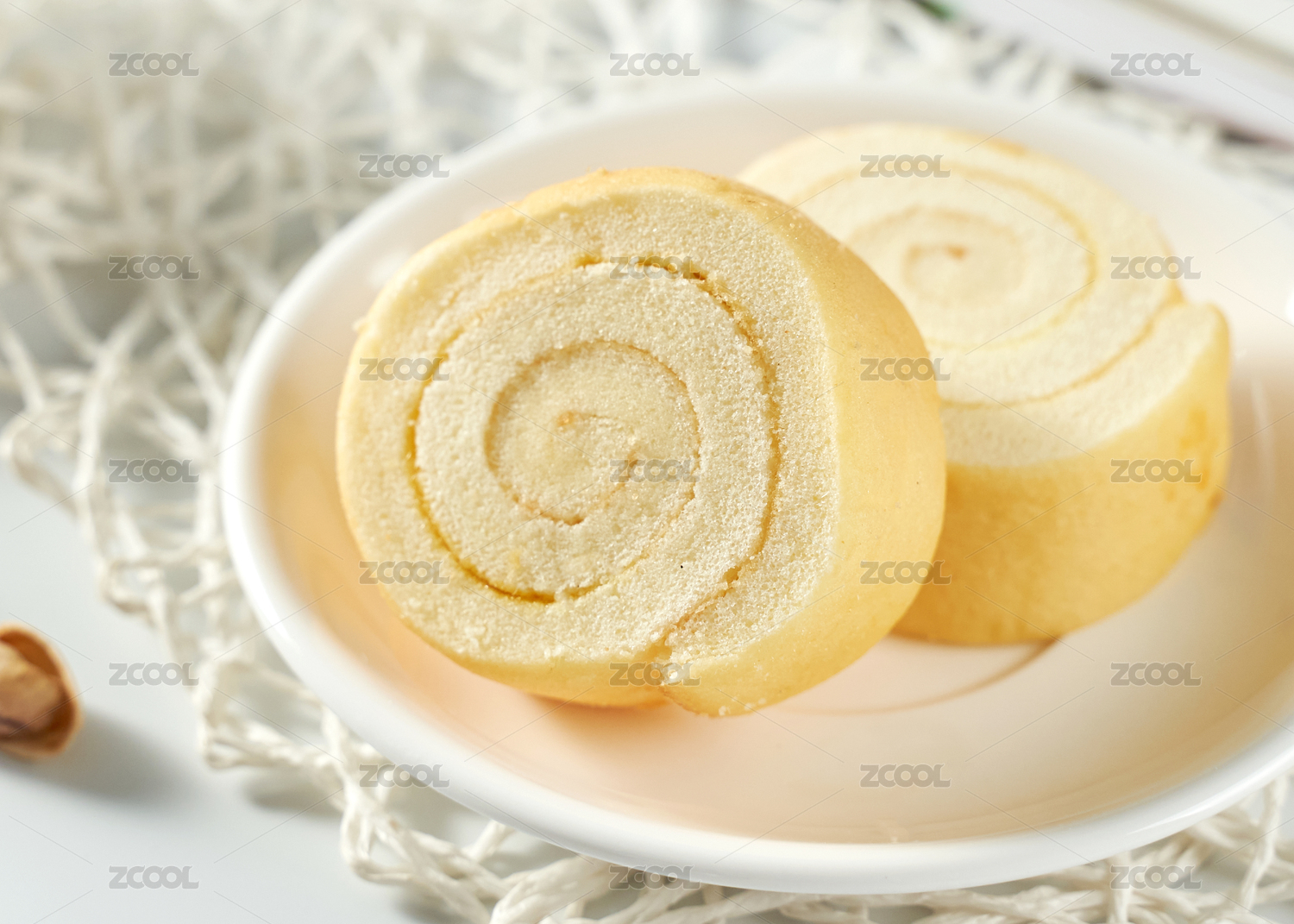 一盘鲜牛乳蛋糕卷摆放在桌面上特写