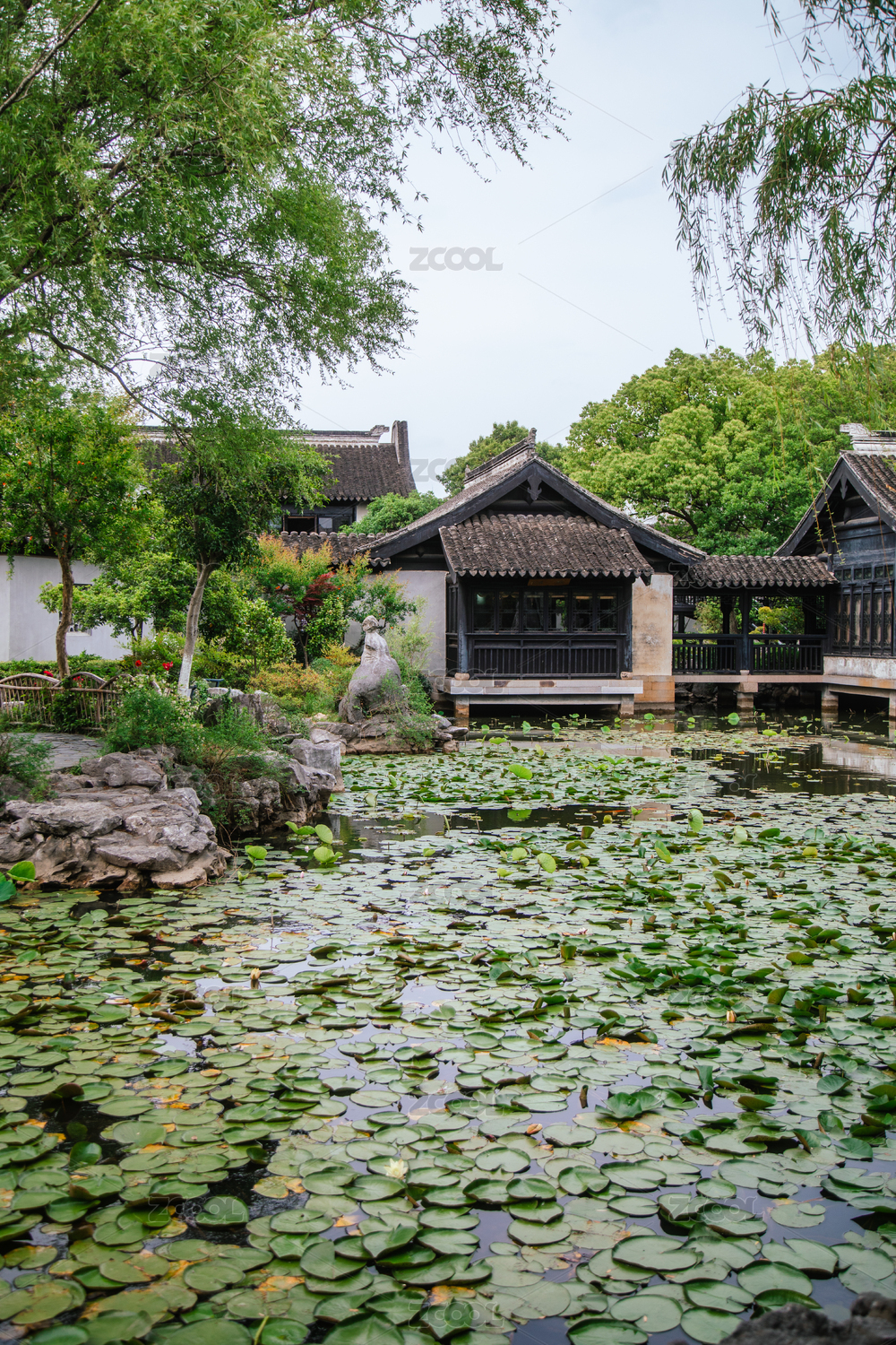 苏州,古镇,江南,蓝天,白云,树木,亭台水榭,严家庭院,假山,荷花