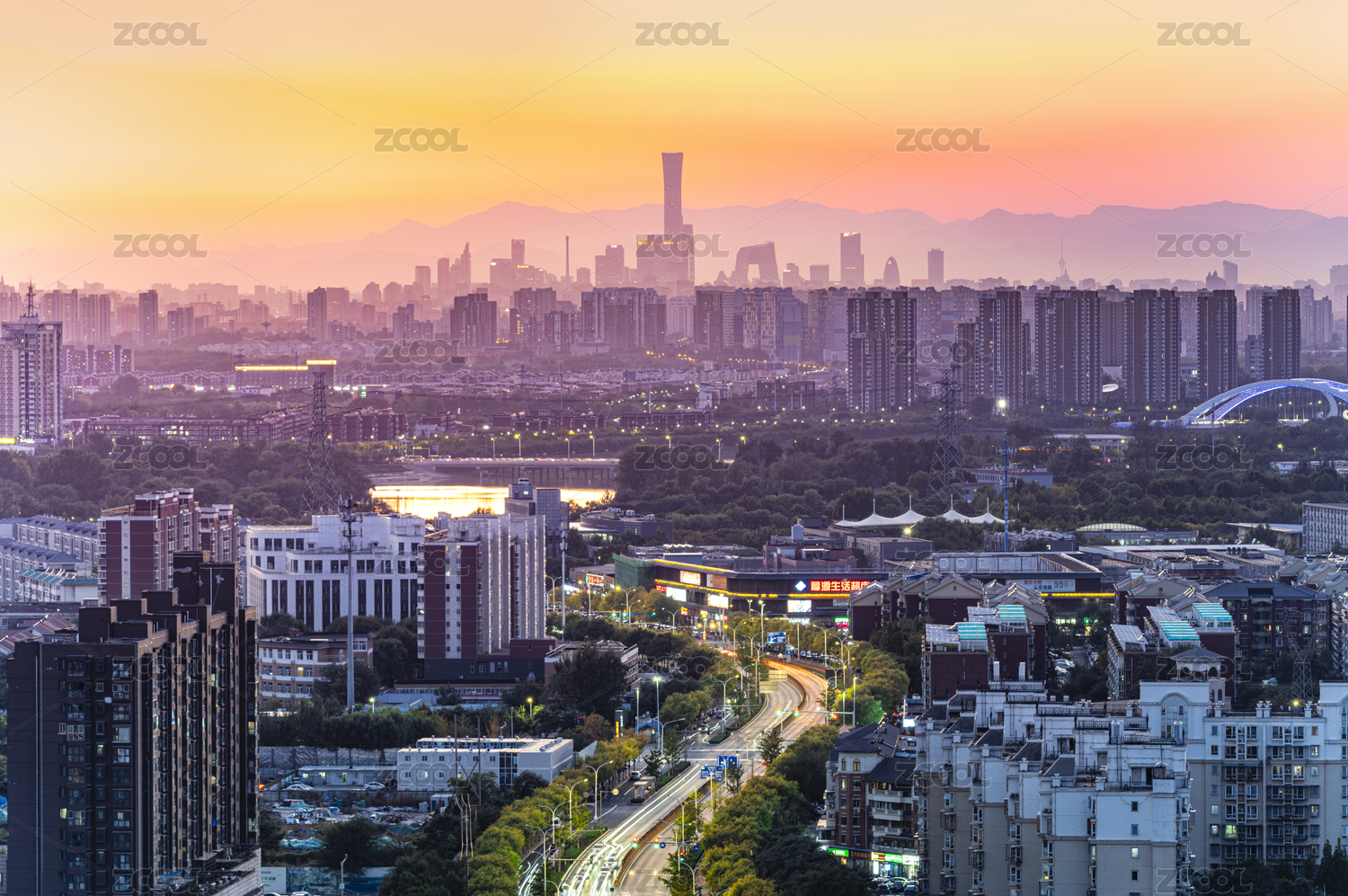 北京市通州区傍晚街景(远处为国贸CBD)