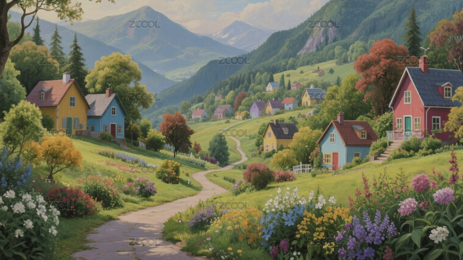 彩色小屋,海边,花路,小镇,鲜花,田园,风景,梦幻,童话,宁静