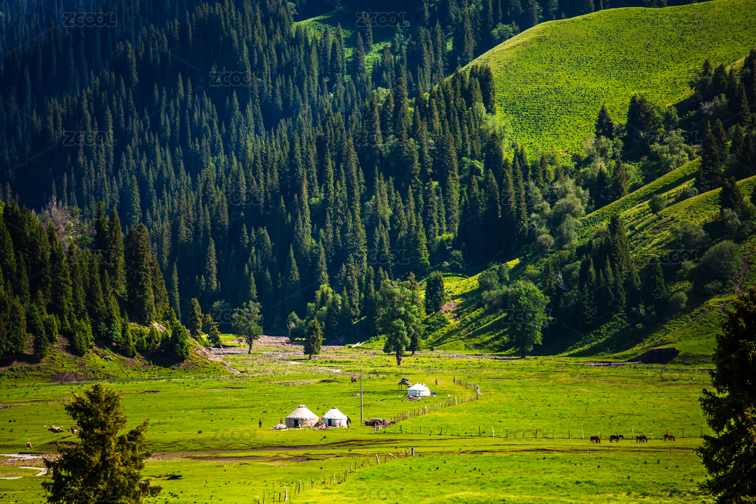 中国新疆伊犁那拉提的雪山草地森林与牧场