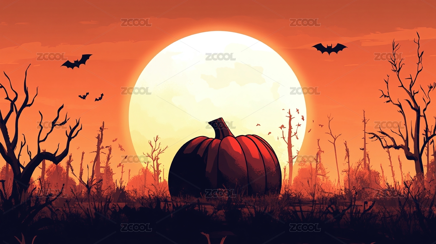 可爱南瓜日落剪影卡通万圣节派对活动插画