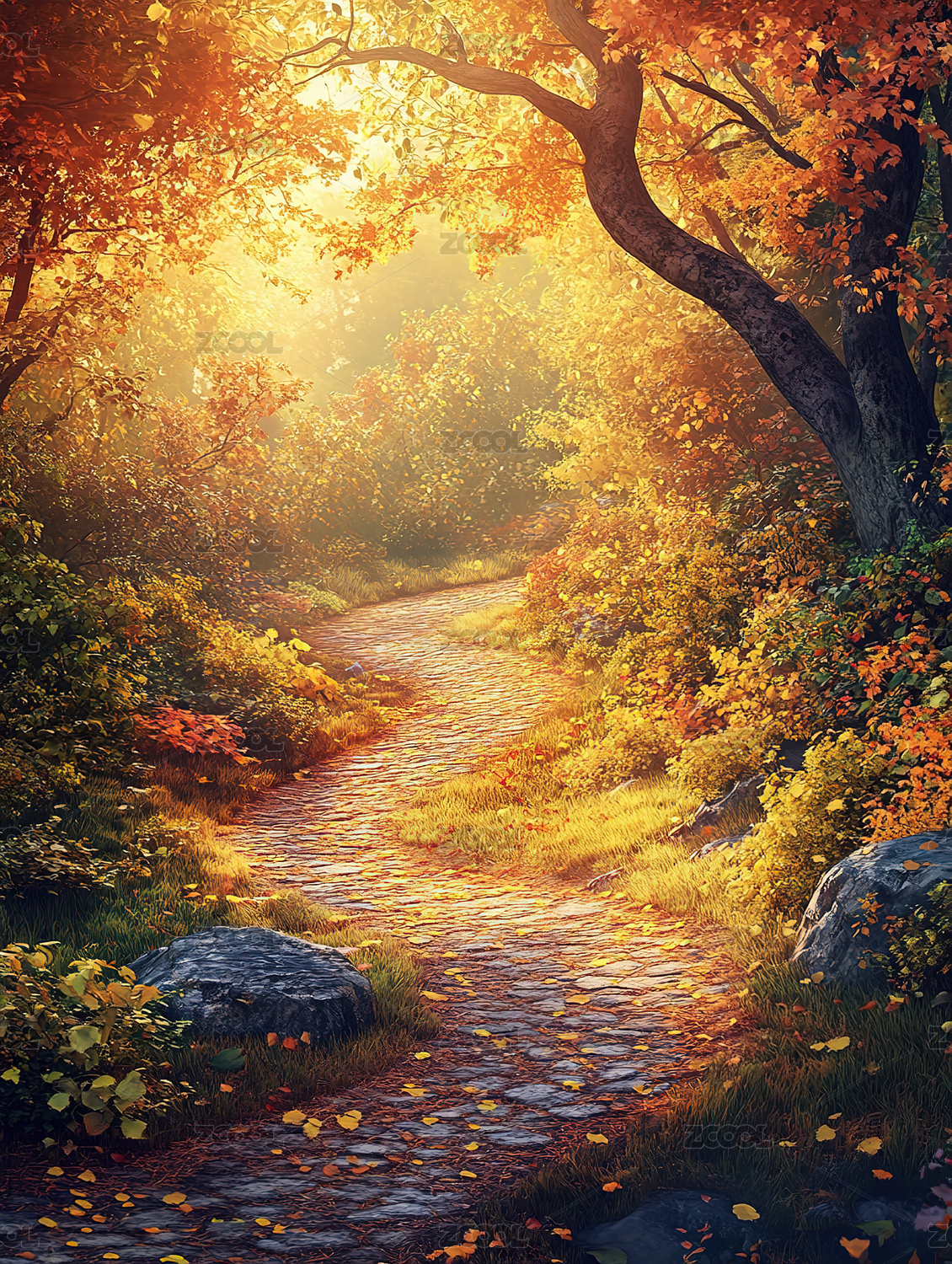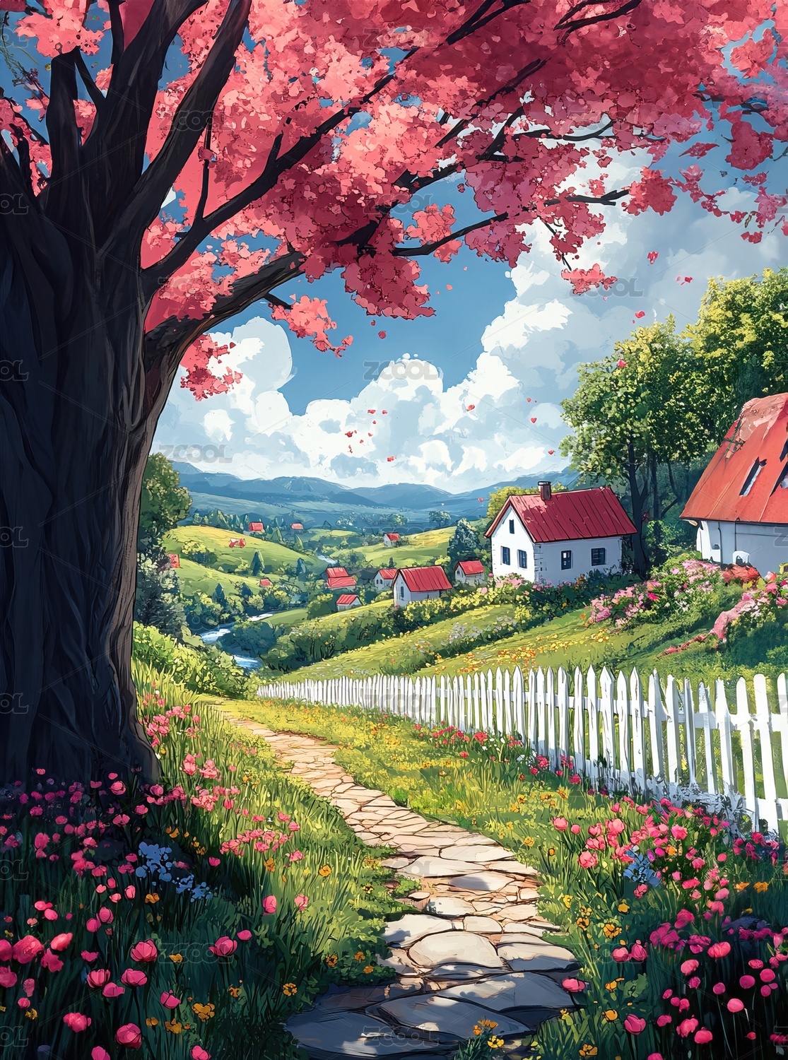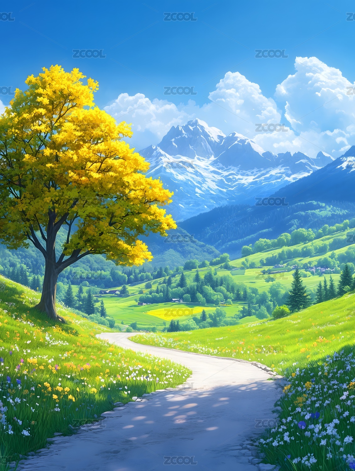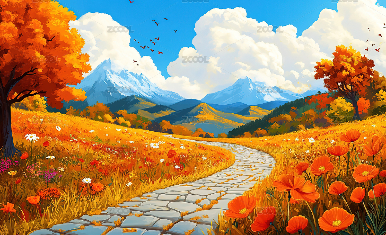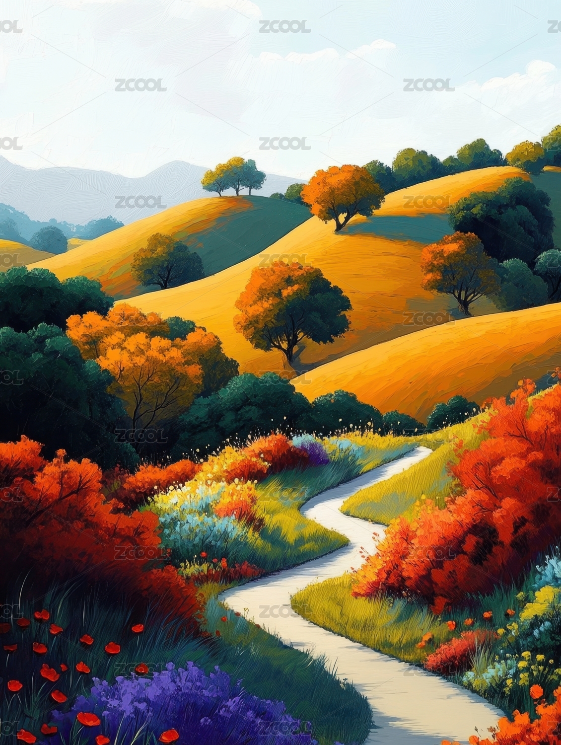 花朵,绘画,自然,宁静,清新,美丽,色彩,风景,秋日,山路