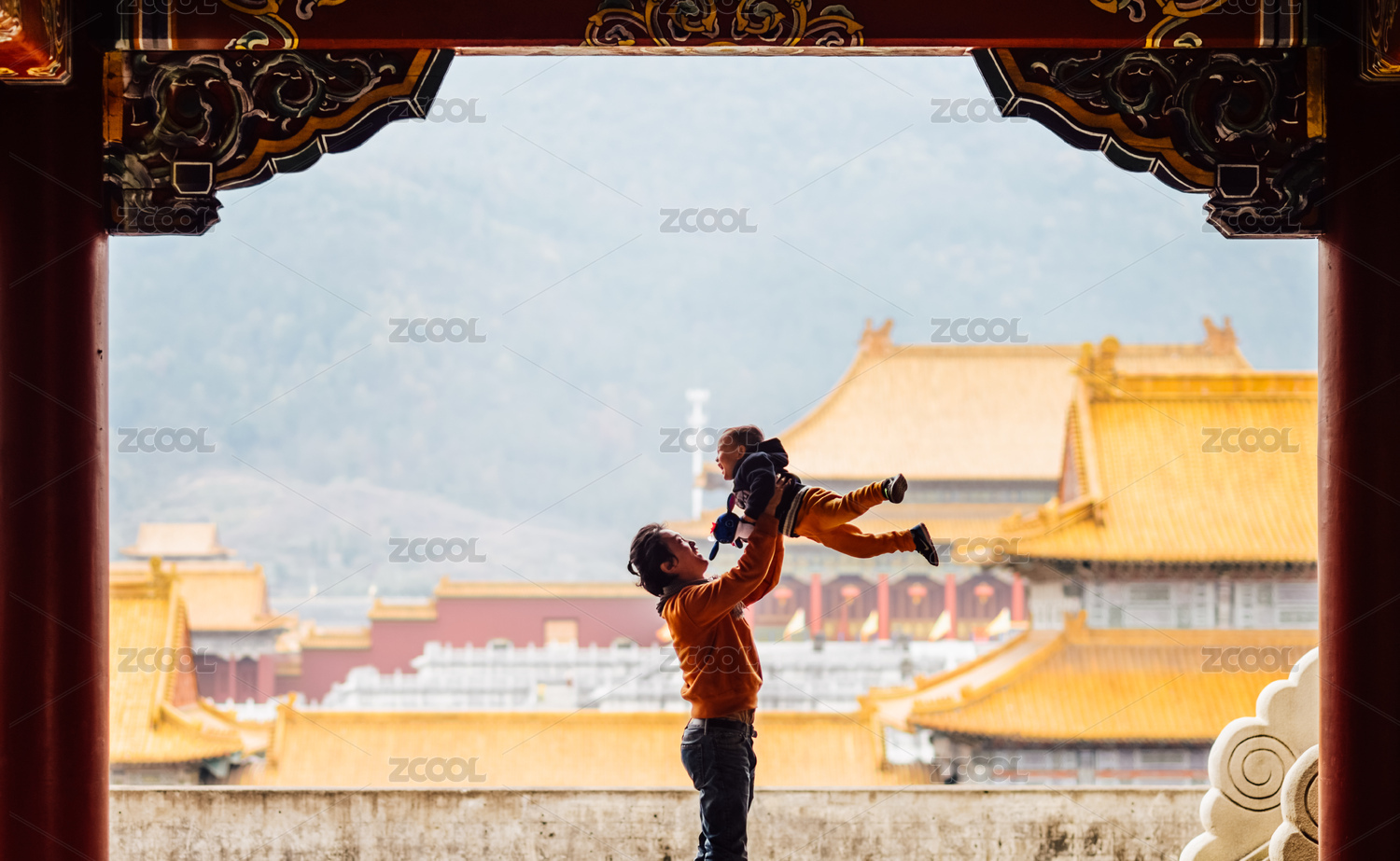 亚裔父子在横店影视城的明清宫苑的紫禁城举
