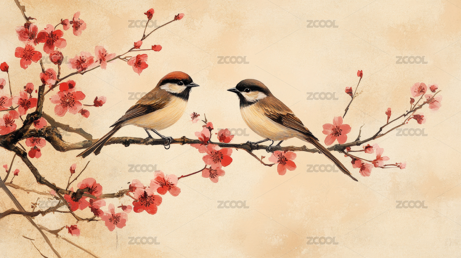 中国风水彩鸟麻雀植物树枝鲜花插画