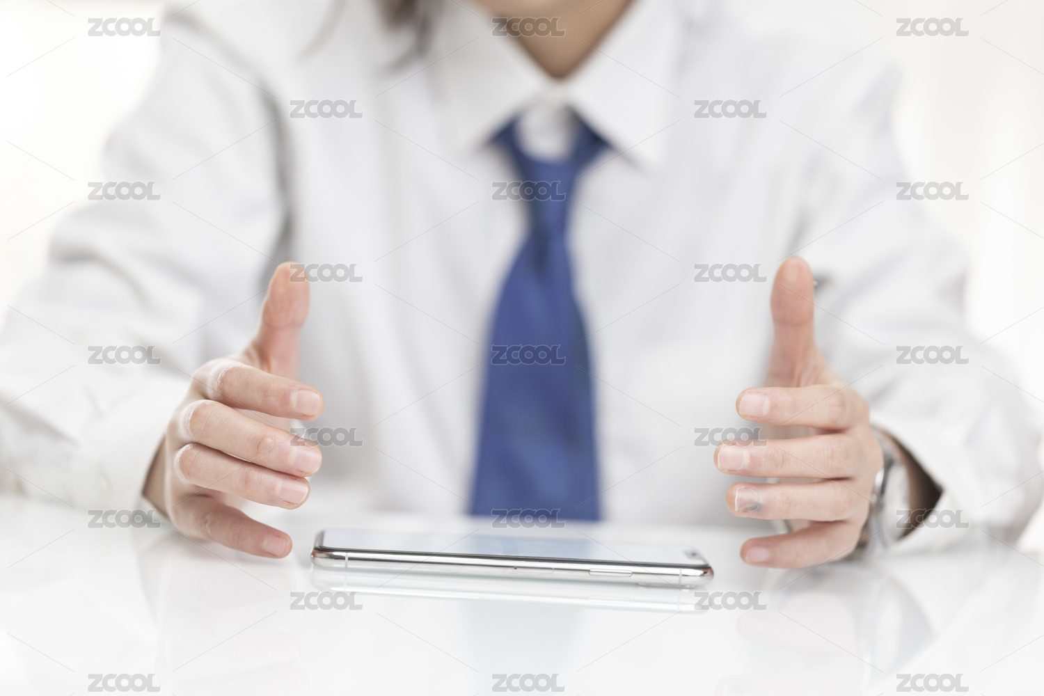 商务男士坐在桌子旁边,正在使用电子产品, 俯视调度