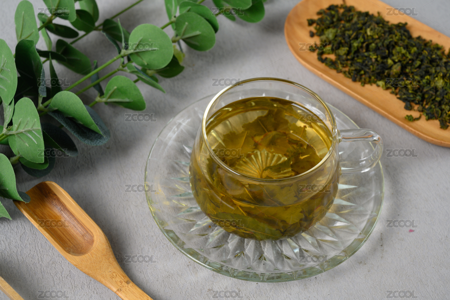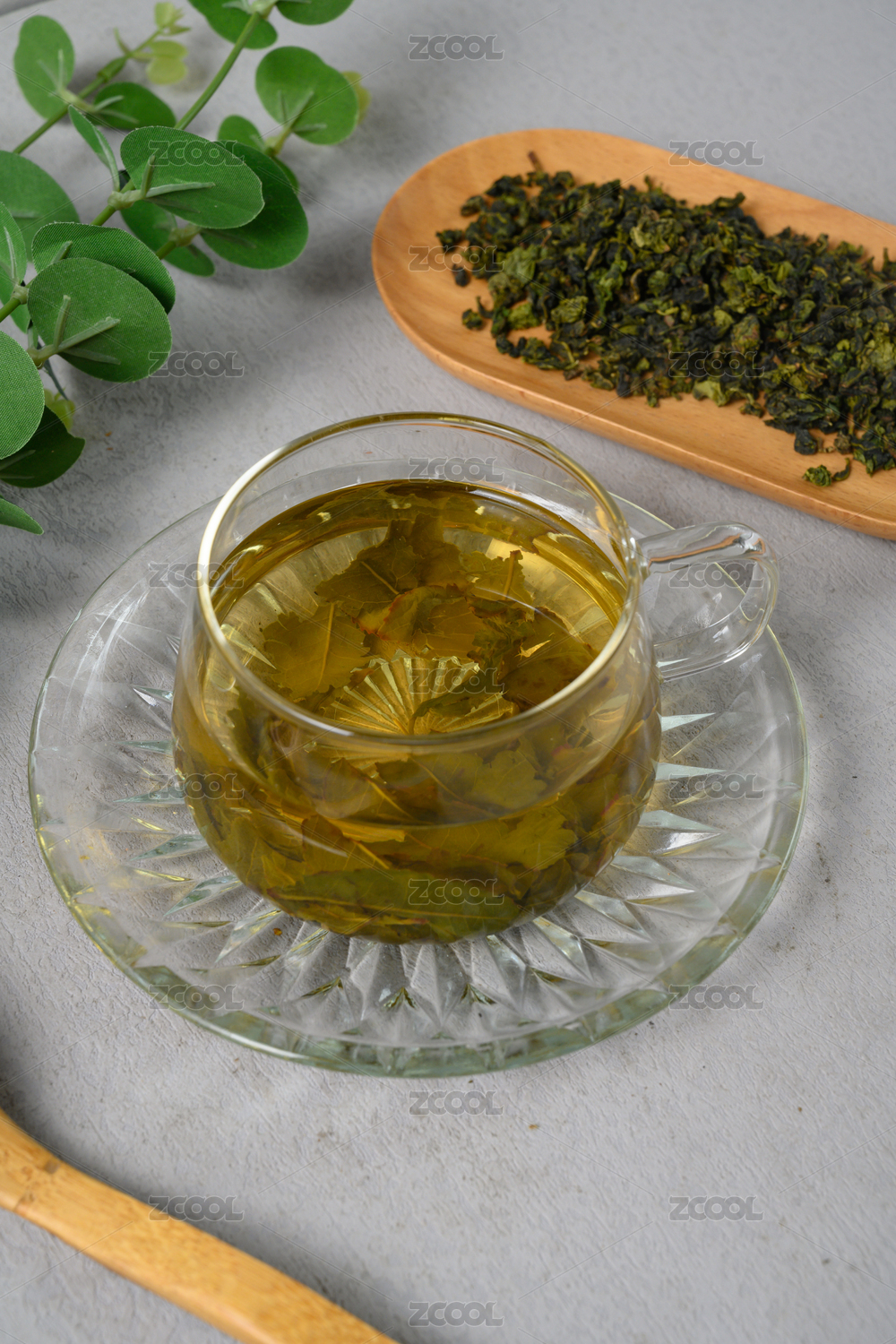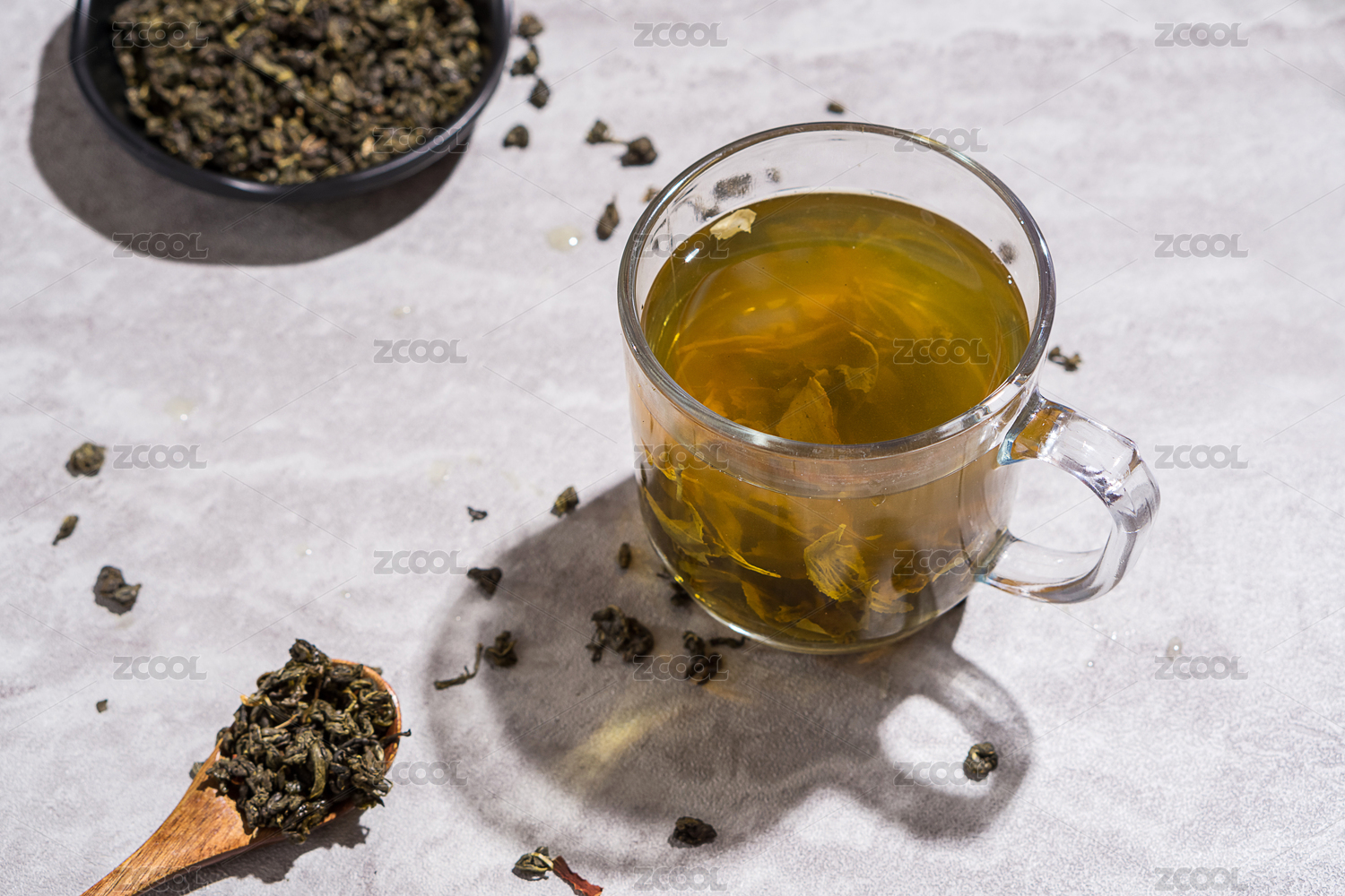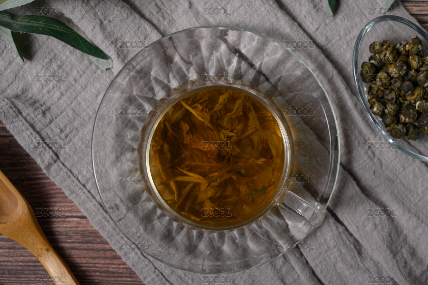 桌面上的杯子里的甘甜可口的茉莉吐珠茶