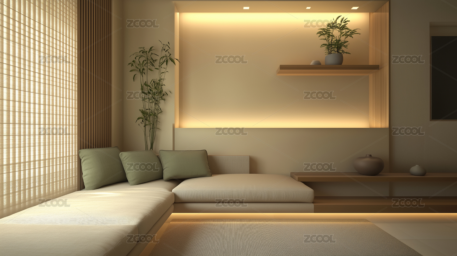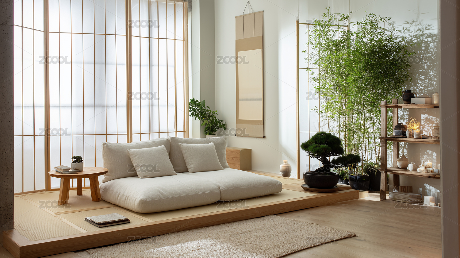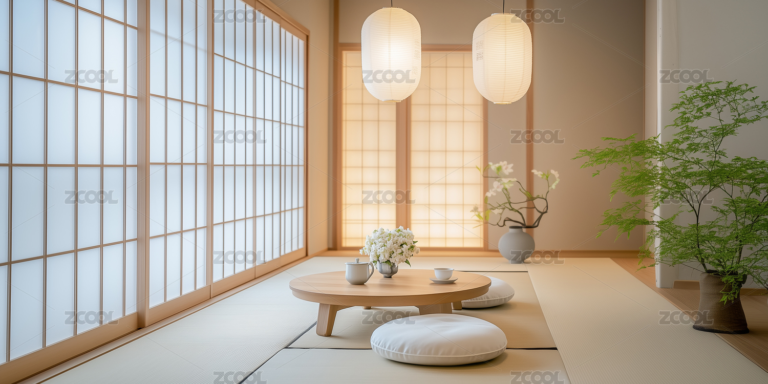 日式,简约,客厅,榻榻米,植物,茶具,靠垫,窗户,自然光