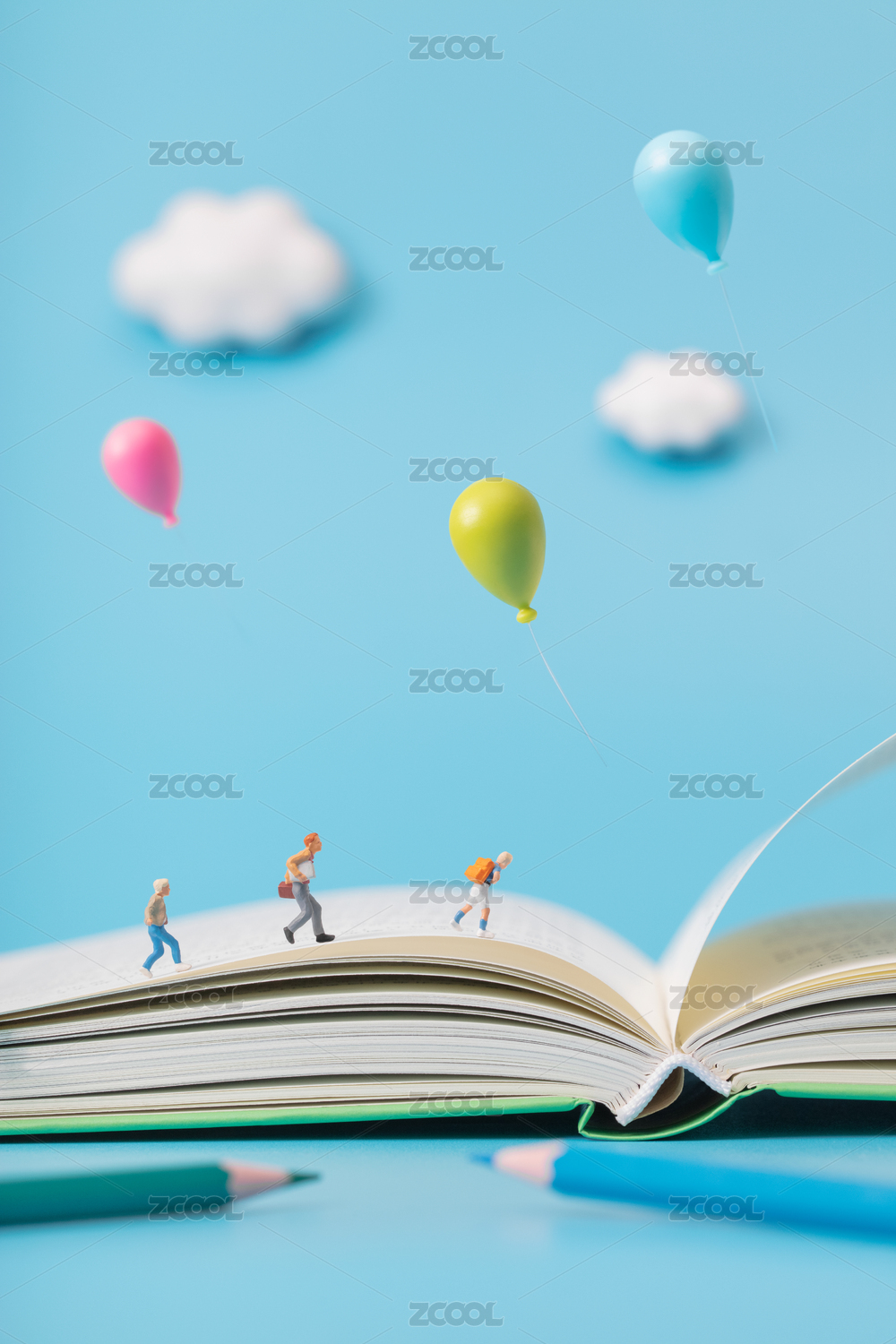微缩创意书本上奔跑的学生与气球
