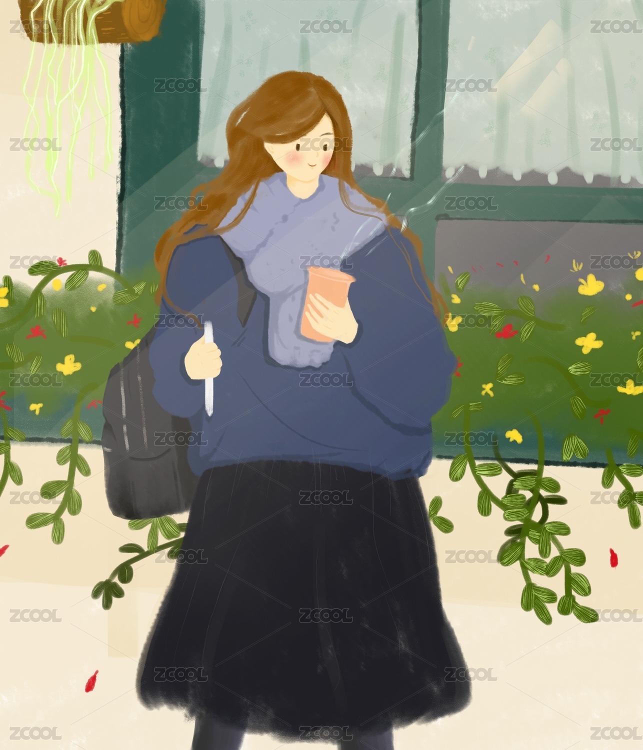 窗边的女孩在冬季的一个晴天收到一杯奶茶