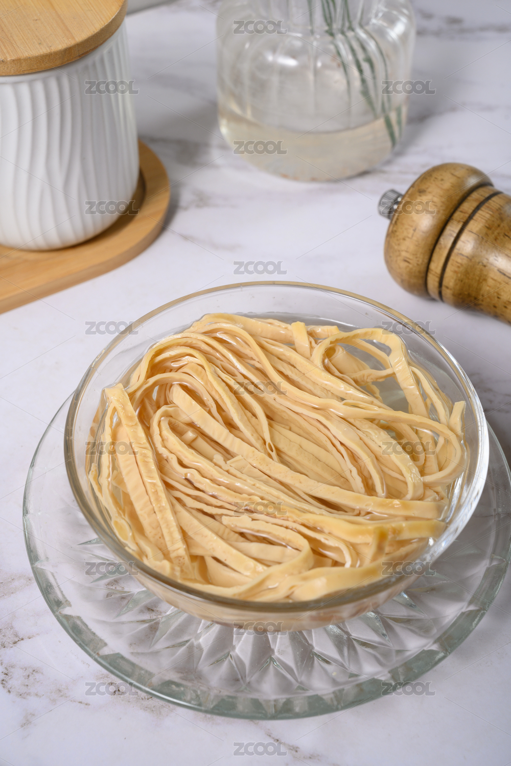 桌面上的盘子里的美味可口的泡发开的豆皮