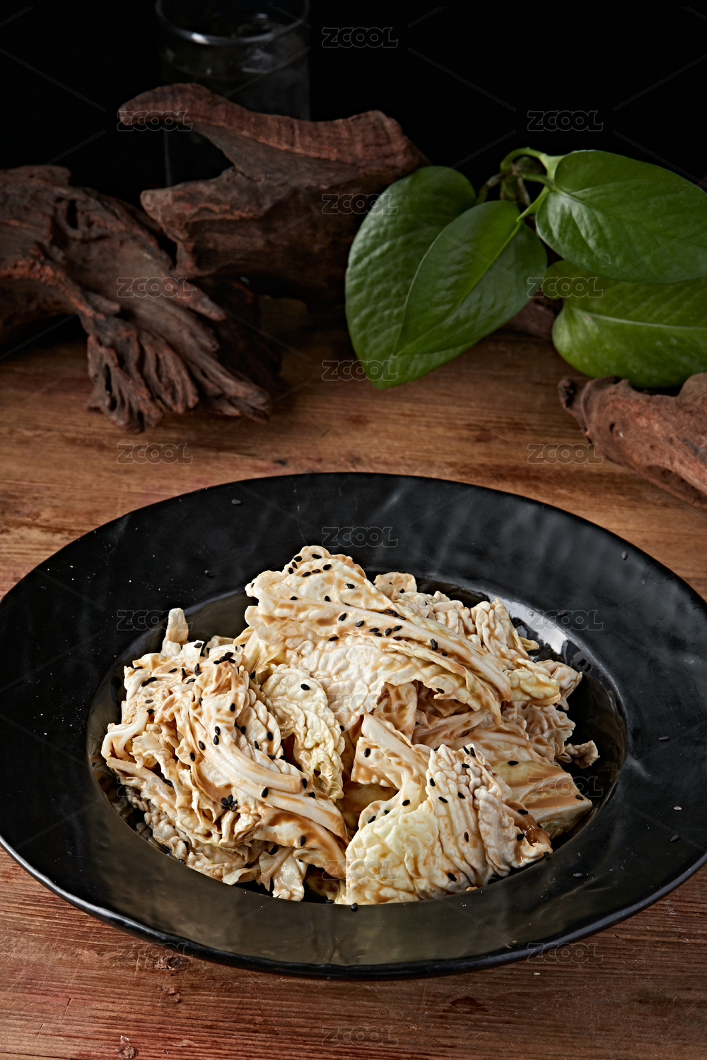 一盘麻辣金针菇下饭菜特写木桌面背景