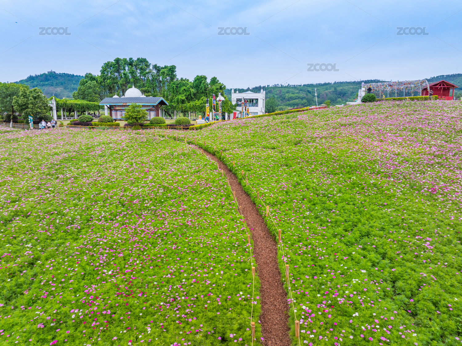 紫色百日草和远处条块分割的花海,中国福建龙岩