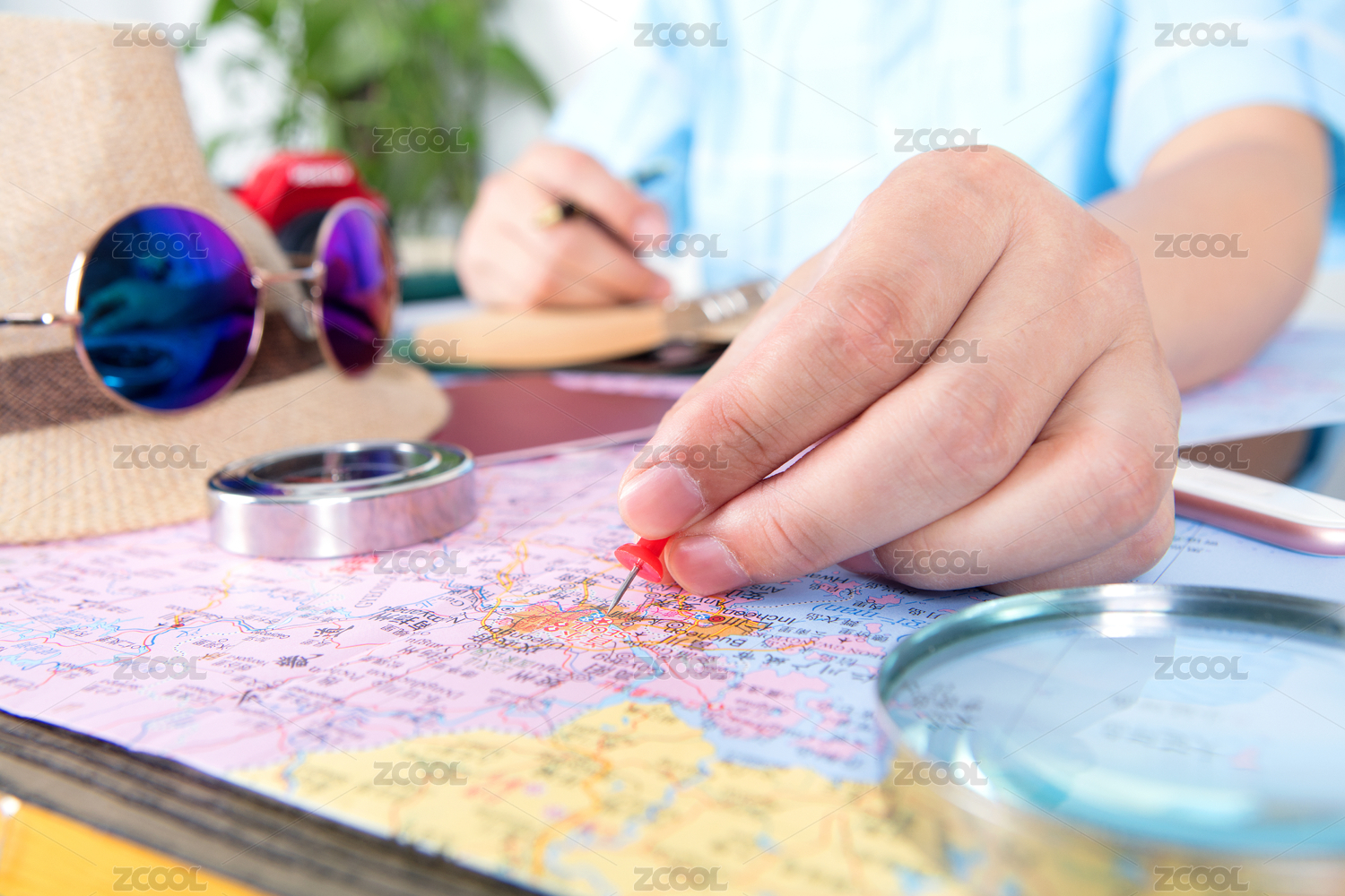 一只手在地图上指着确定的位置另一只手用圆规测量距离