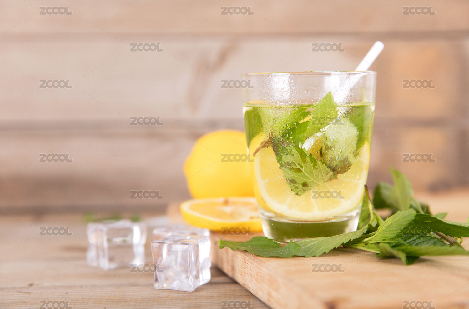 一杯冰镇柠檬杂果茶和新鲜的薄荷叶及散落桌子上的冰块