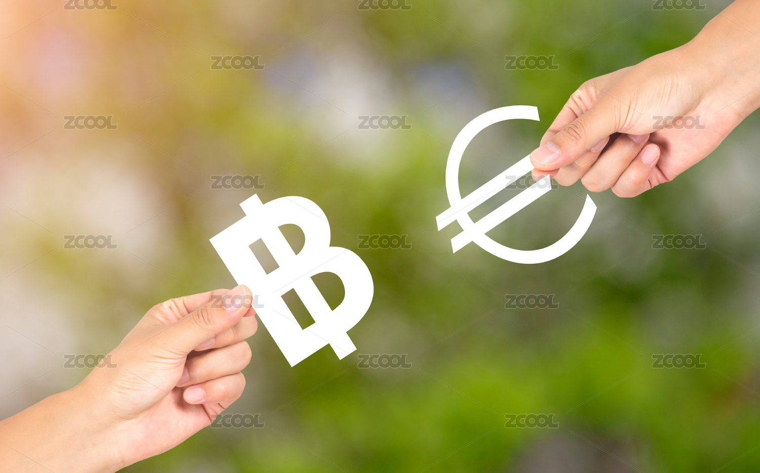手拿泰国货币泰铢符号和另一只手拿欧盟货币欧元符号争锋相对