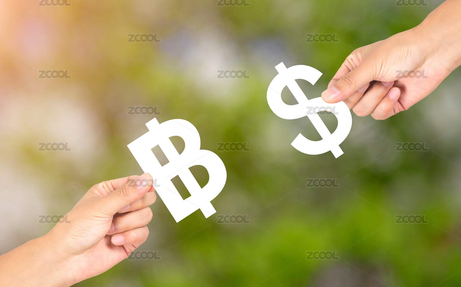 手拿泰国货币泰铢符号和另一只手拿美国货币美元符号争锋相对