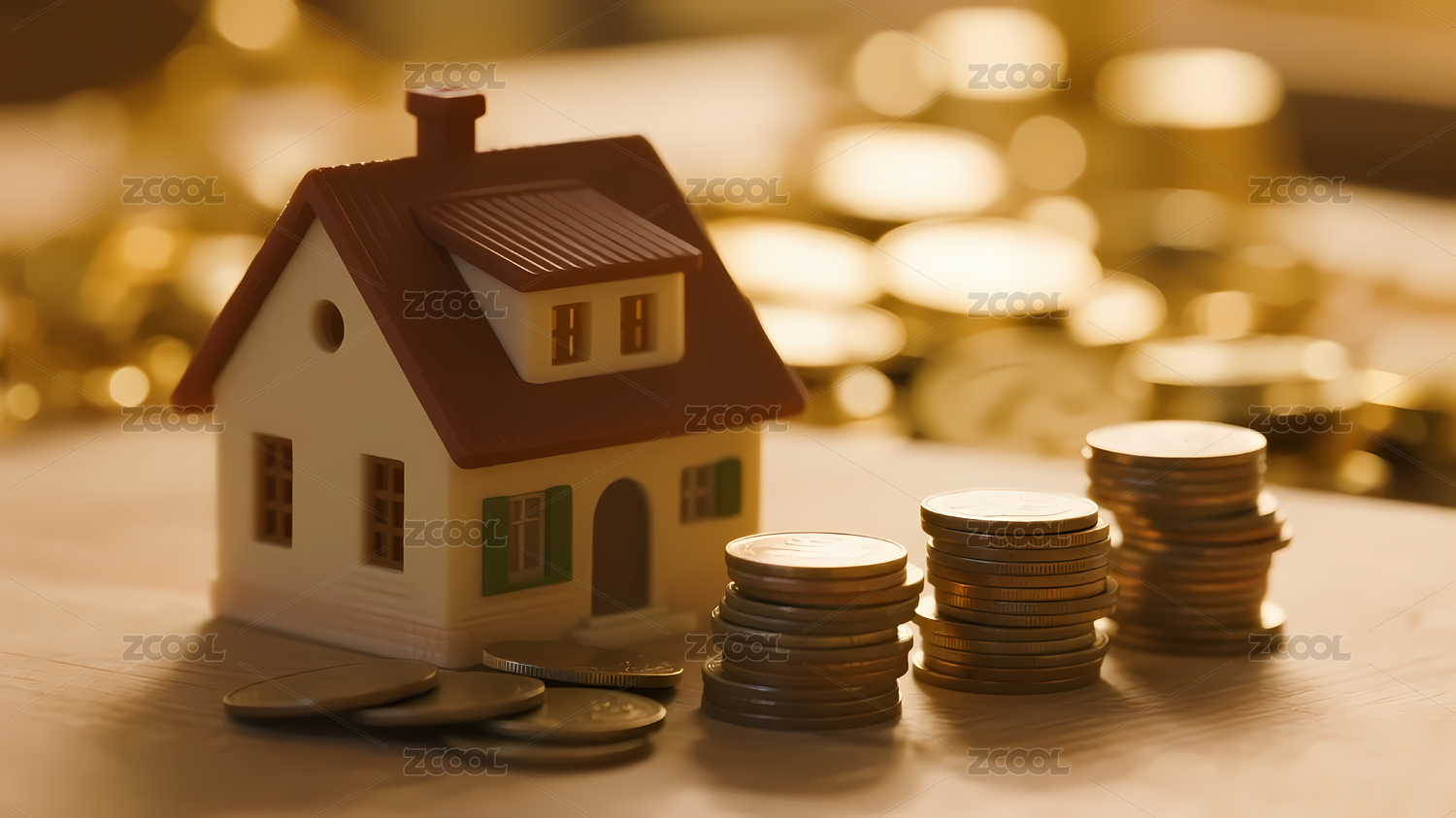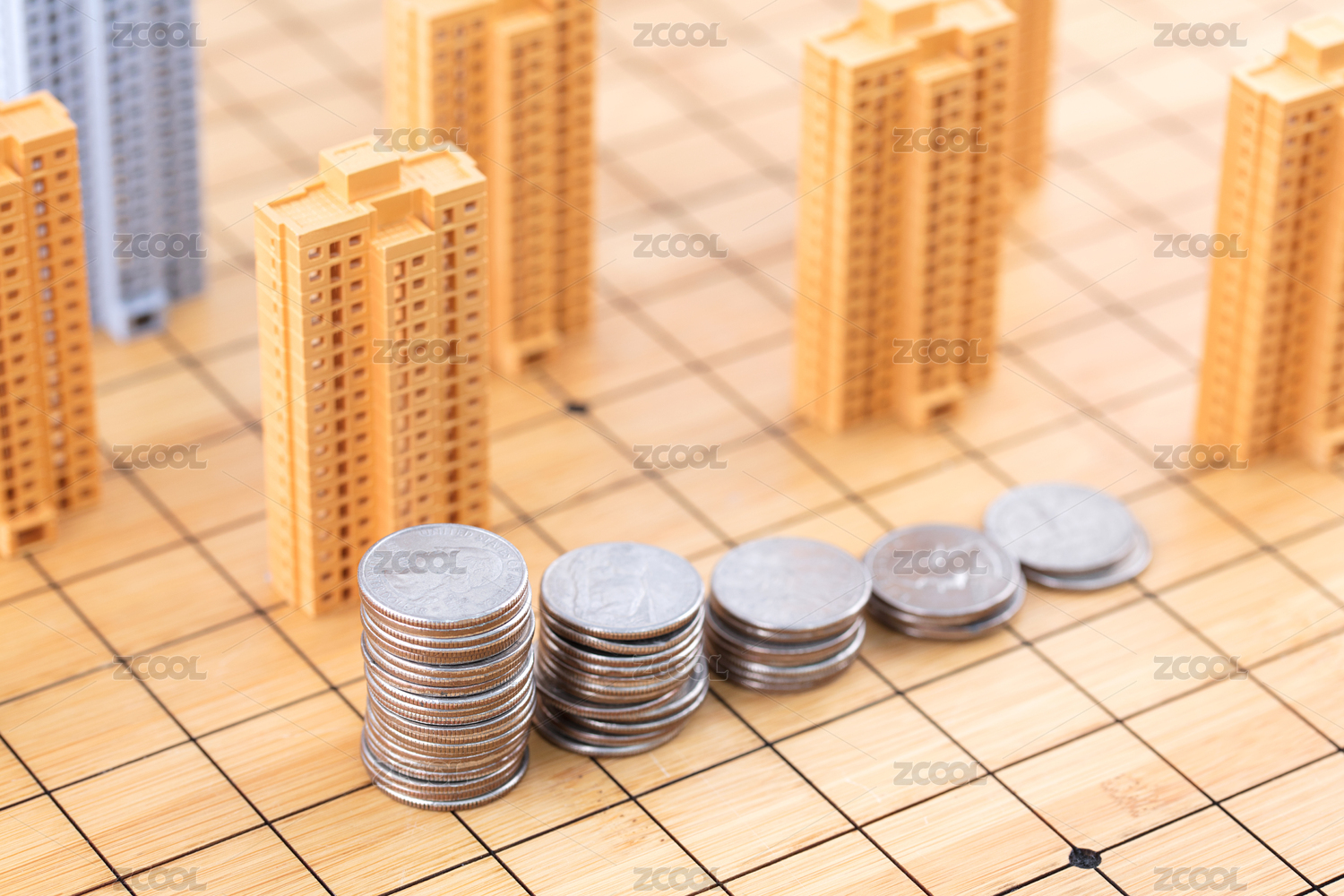 房产背景前一东方女性的手从四撂高低不一的硬币中取走两枚