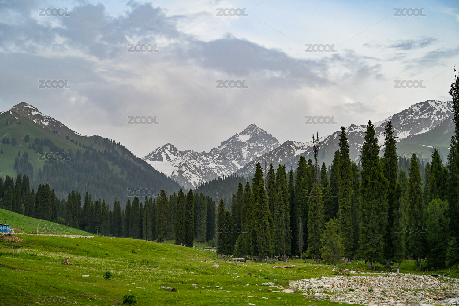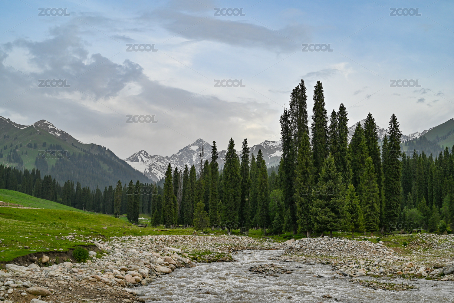 中国新疆伊犁蓝天白云下的雪山草原森林小溪