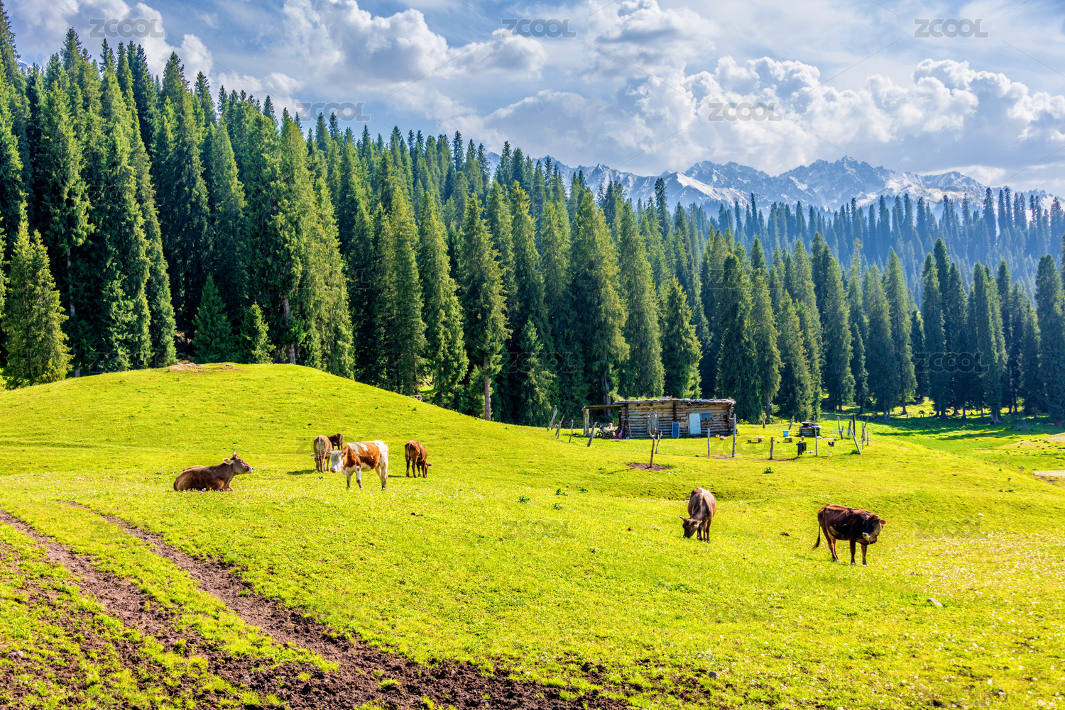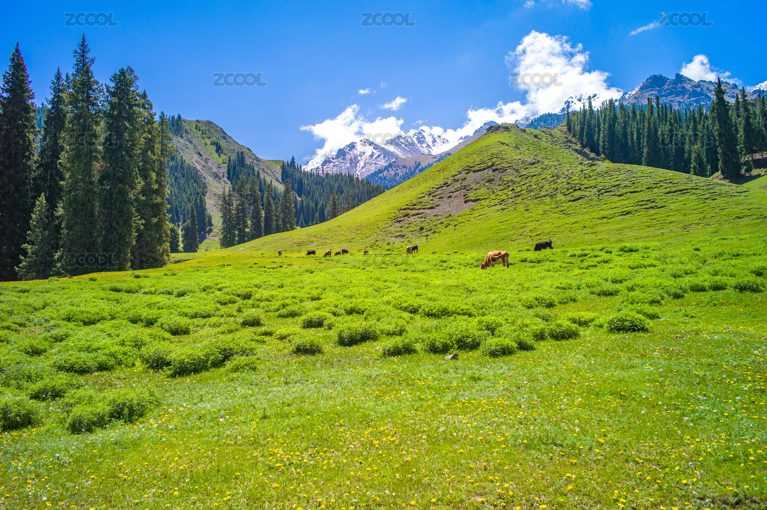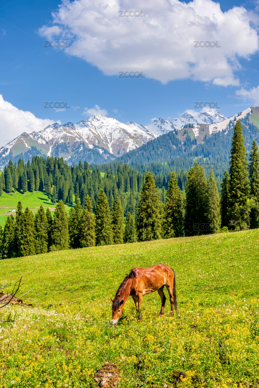 中国新疆伊犁琼库什台雪山森林草原牧场马