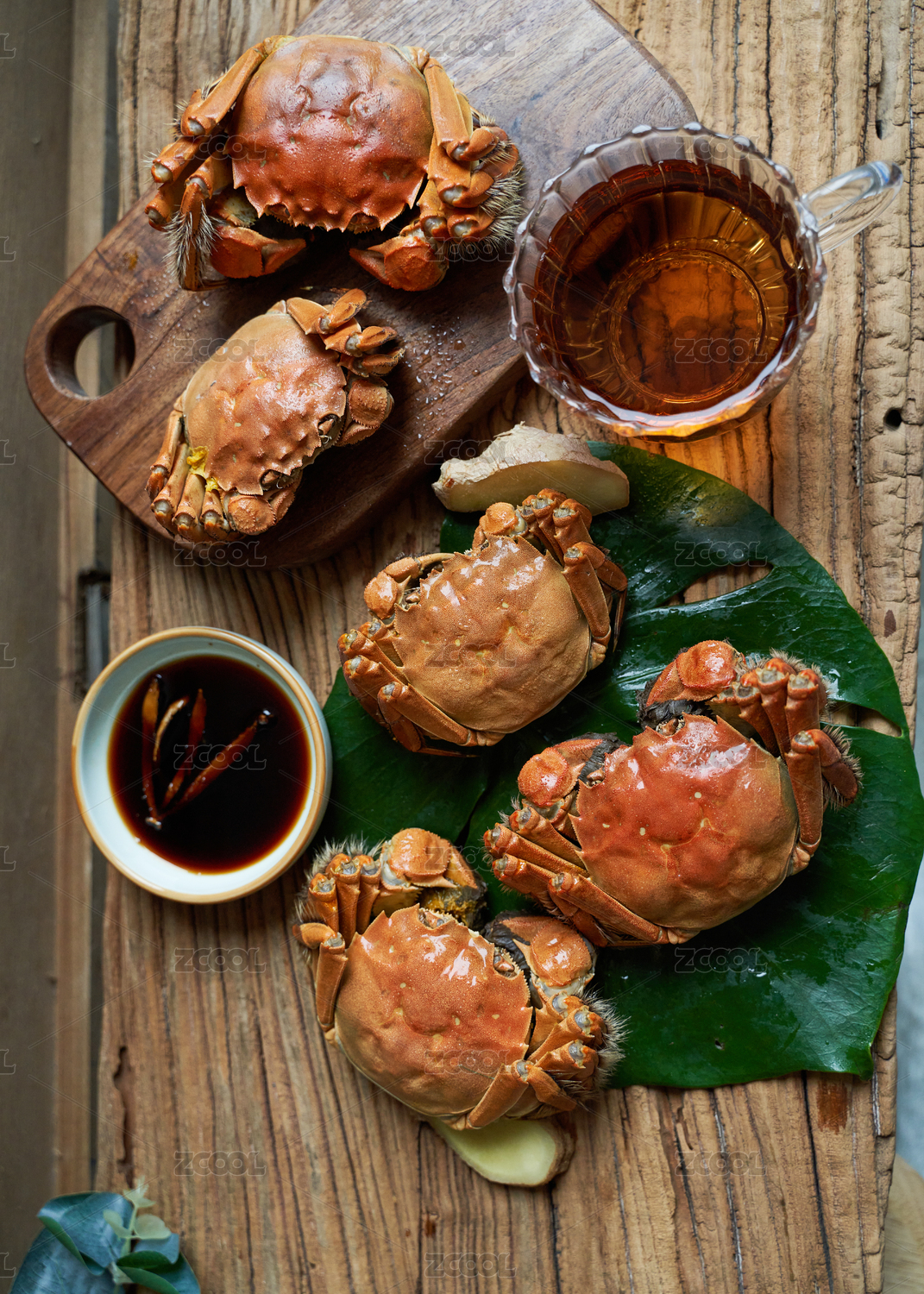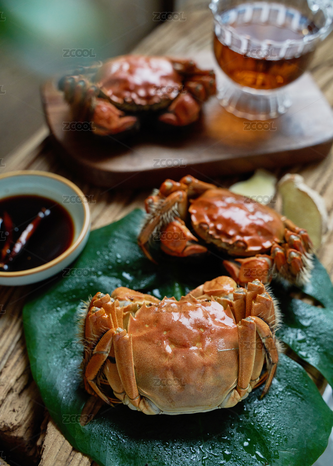 木纹背景上摆放熟的阳澄湖大闸蟹