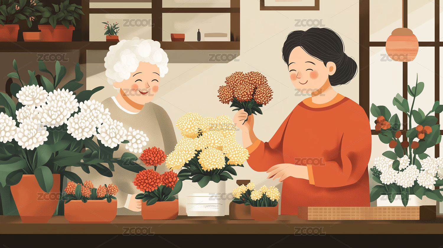 AIGC202406,重阳节,陪伴,老人,关怀,尊敬,花,室内,长袖,拿着