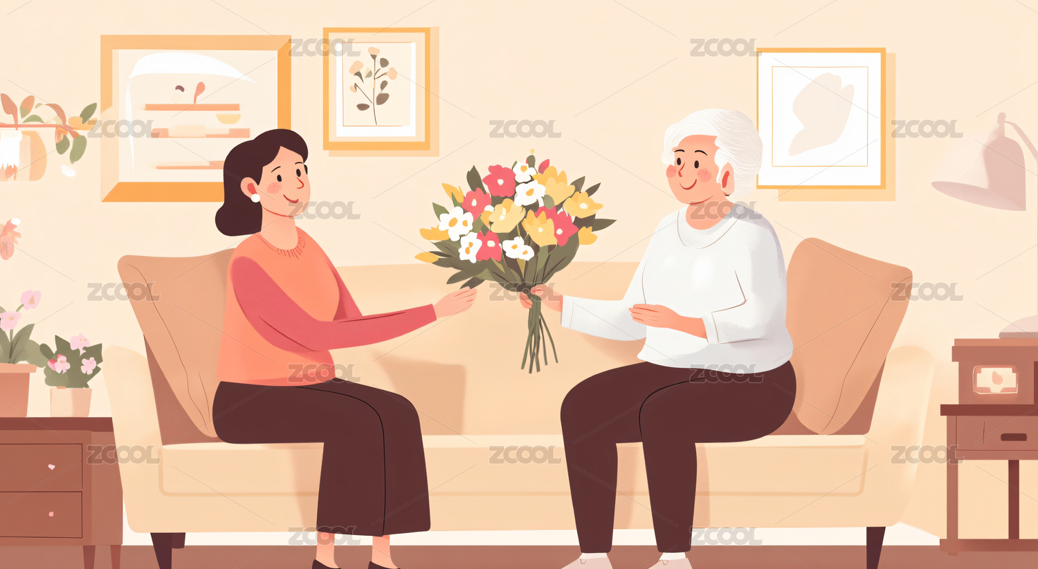 温馨的室内,年轻的女儿给年迈的母亲送花