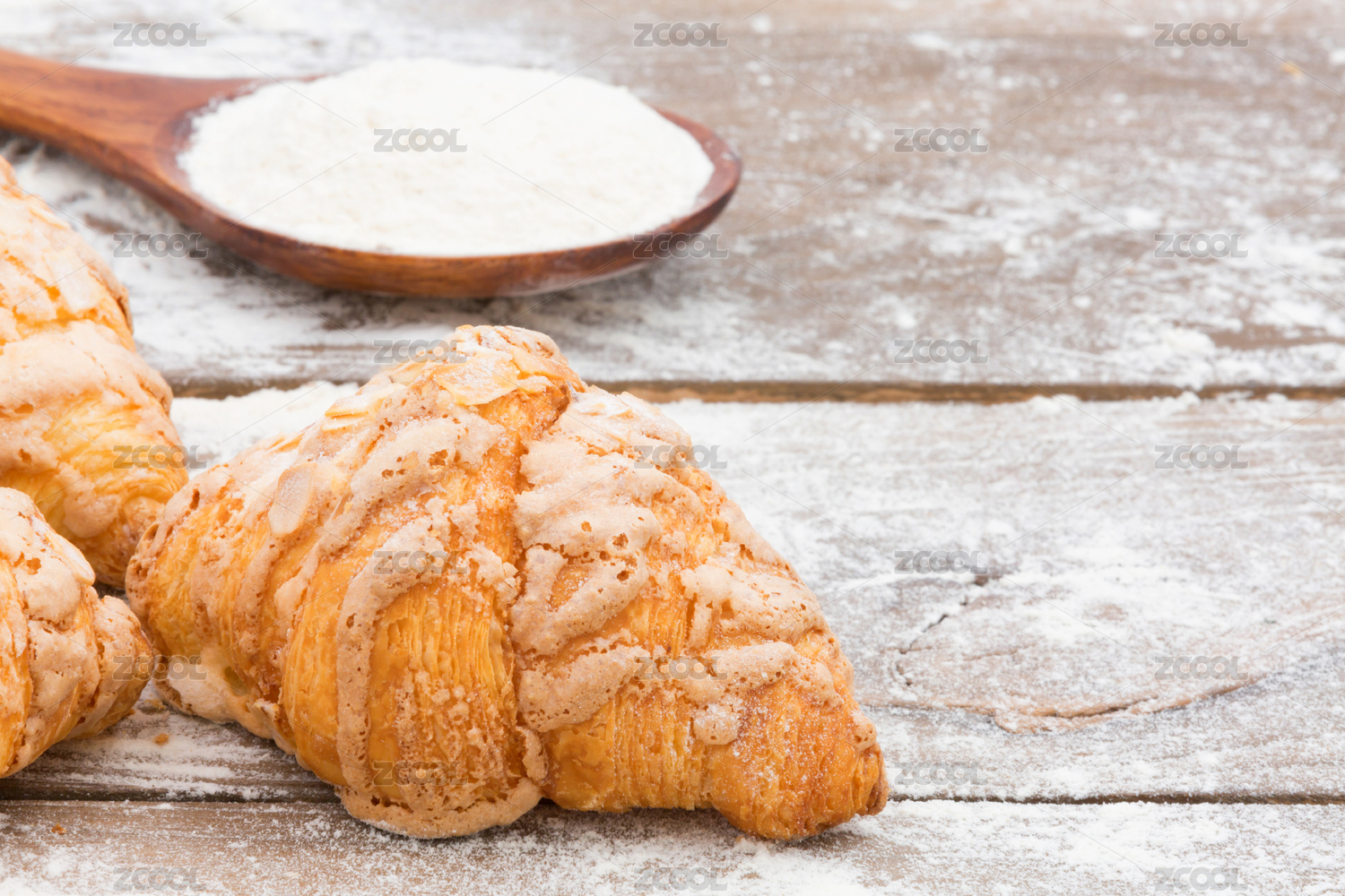 木制桌子上的早餐可颂牛角面包和咖啡牛奶