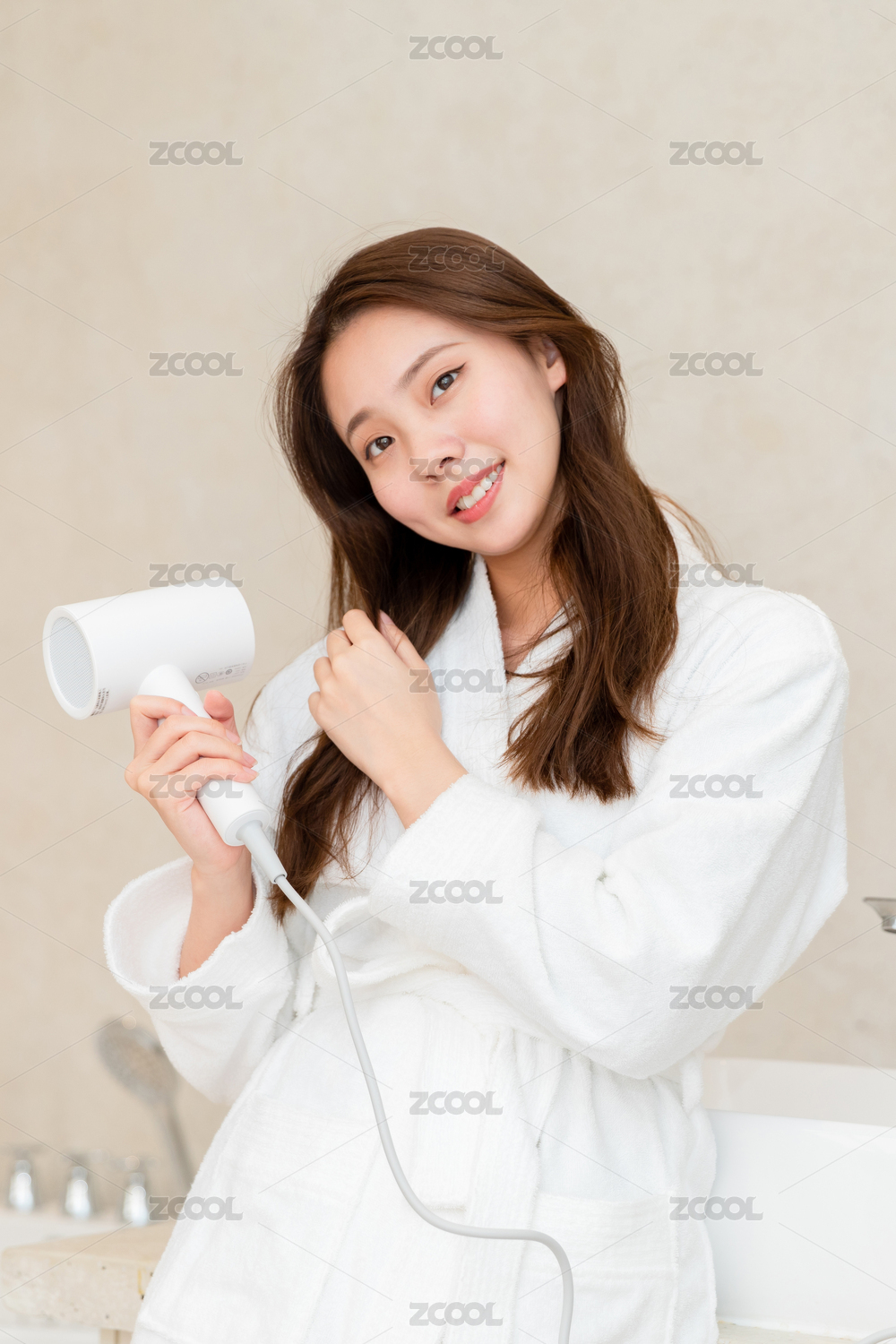 舒适,美女,微笑,开心,浴袍,沐浴,洗头,吹头发,吹风机,吹