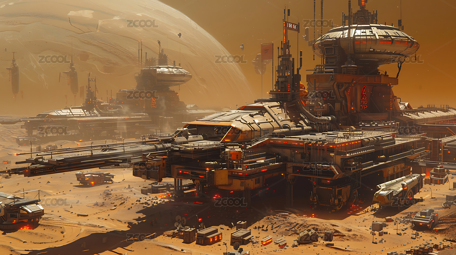 宇宙飞船悬停在异星的基地上空