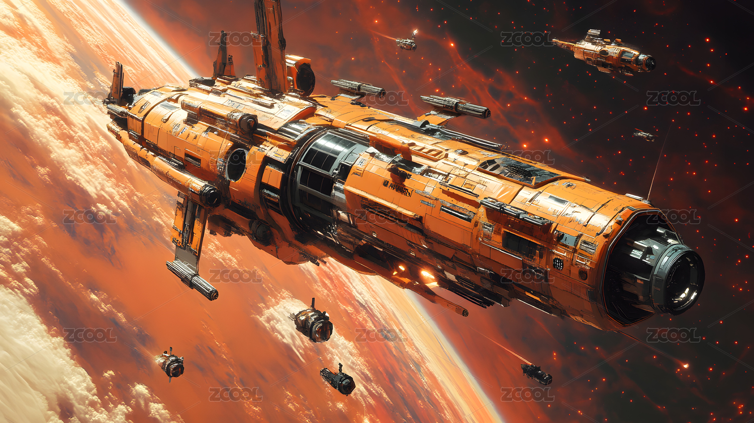 橙色宇宙飞船环绕星球飞行