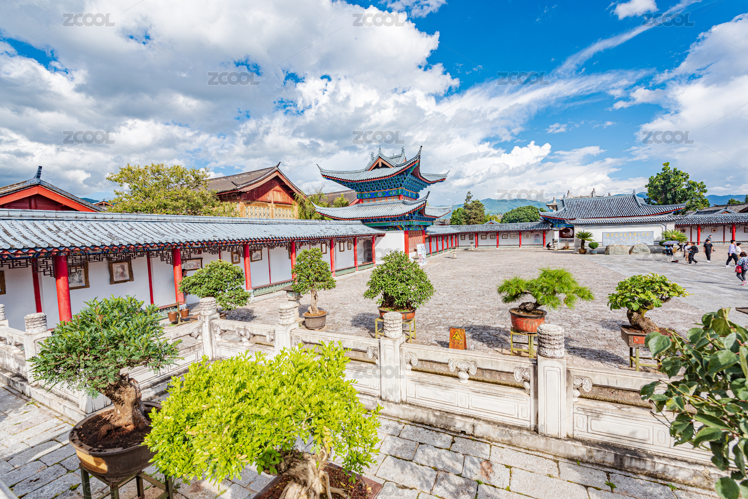 蓝天白云下的中国云南丽江古城木府建筑景观