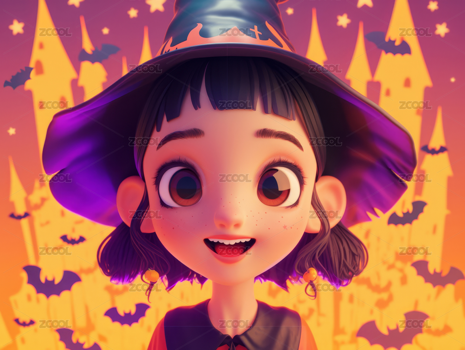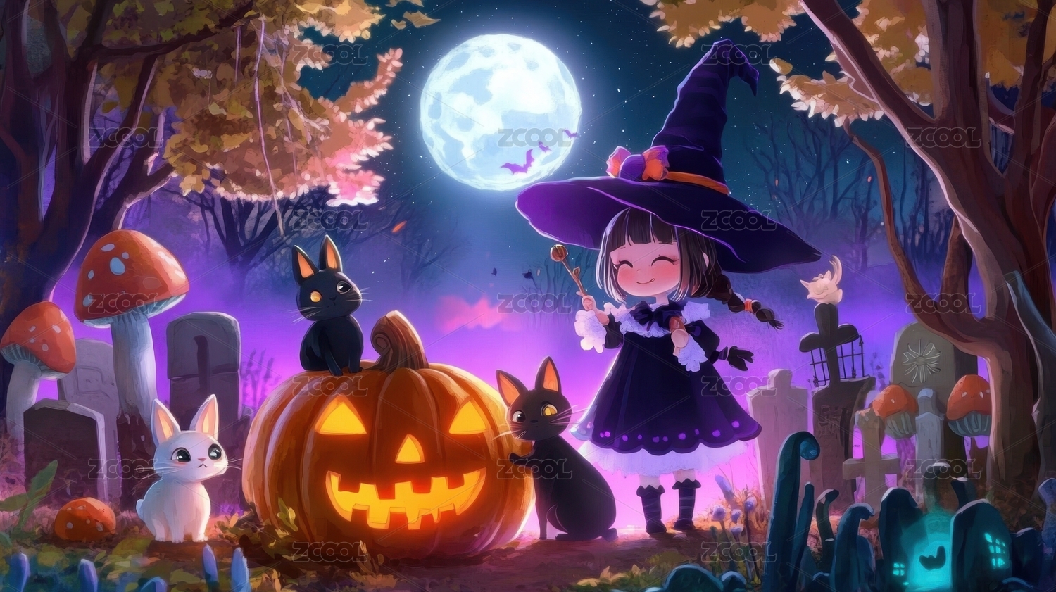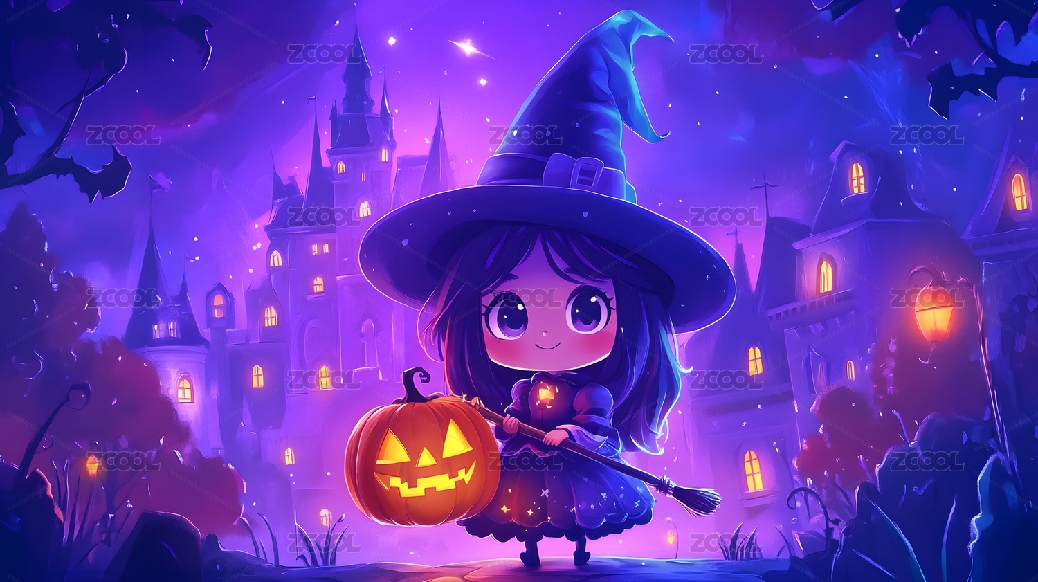 万圣节恐怖卡通女巫平面矢量横幅背景