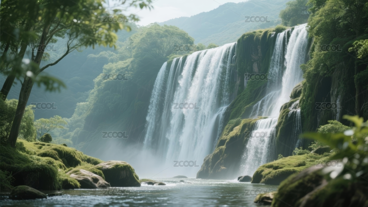 山间瀑布下的翠绿自然景观