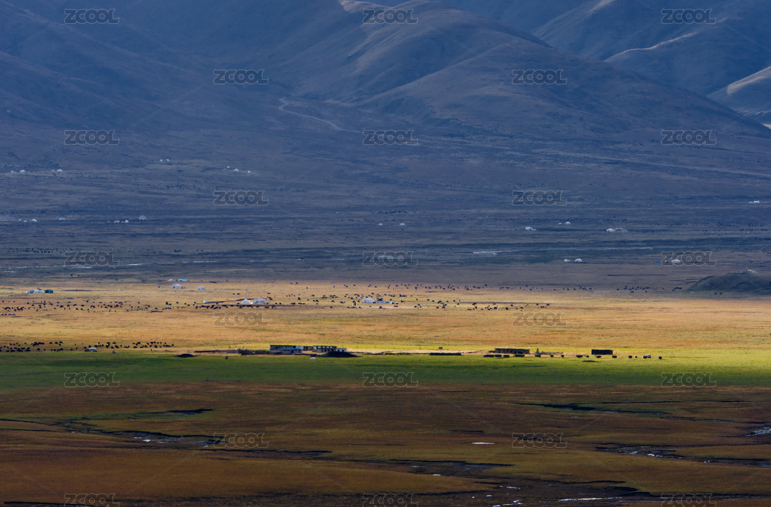 四川省阿坝九曲黄河第一湾草甸草原上的牧场俯拍